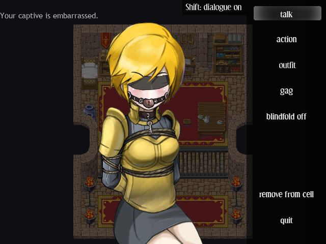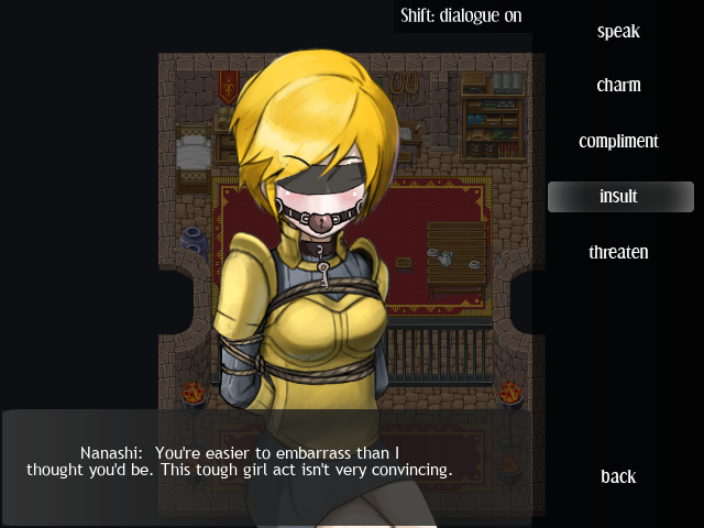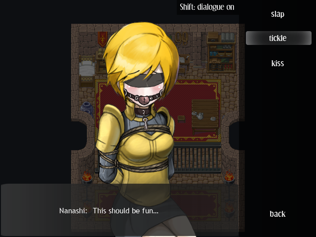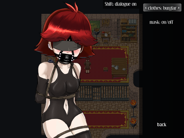 The game is set place "in a fantasy land where women are constantly bound and gagged," to quote the wiki. I like where this is going. Anyway, you're playing as Suki, who's going to be crowned, but just before the ceremony she's kidnapped. And bound. And gagged. Like it should. Khm. So you end up in some underground dungeon, the lair of a kidnapping guild, and what do you do? Escape. Apparently the guild has a problem of many girls escaping recently. Just... ignore this "you had one job" problem, treat it as an eroge, where things don't have to make sense. So after escaping the bonds and your cell (since the guard left the keys in a place where you can reach) and picking up a dagger, you single-handedly get rid of the guards, you run into the boss, who gives you an offer you can't decline. Yeah, turn off your mind, it doesn't make sense (it will make a bit more as you complete the game, though). So that's how the game starts, you gotta help the kidnapper guild, in exchange they will help you track down that traitor bitch.