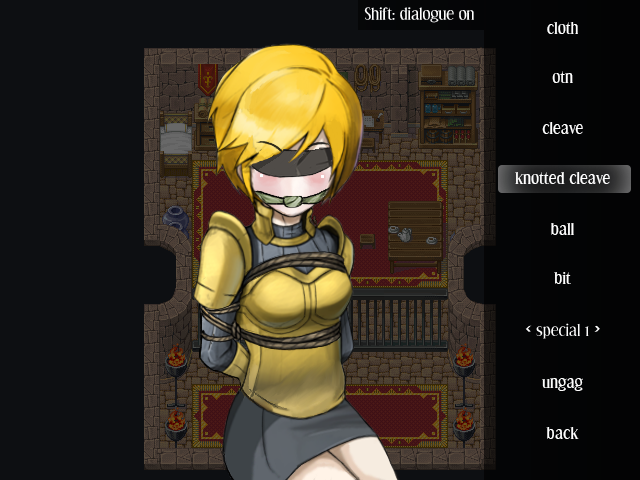 The first is used during the battles. With male enemies, you just beat them until their HP reaches zero, when they just disappear, as usual. However, girls' HP can't go below 1—instead they will start flashing red when their HP is low (below 5%, I think). In that case, you have to use the "Subdue" skill, which is actually just a fancy way saying "tie that bitch up". Note that this whole thing works in reverse too, so your characters (whose are always girls, except a few times at the very beginning) can't die, but they can be tied up. You win the battle when you get rid of all male enemies, and you tie up all female enemies, and you lose when all your girls are tied up. This has a few consequences: