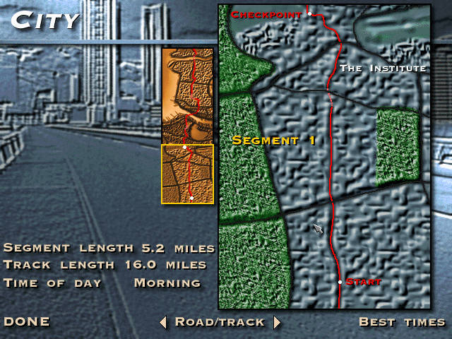 As for the tracks, there are also 8 of them in the Special Edition, with one extra unlockable. You also have a map and an audio commentary, like in all classic NFS games, if you think about it, many of the basic features of the early NFS games are already there. One trivia is that this game had point-to-point sprint races, not just circuits. Before I tried this game, I always thought NFS5 (that weird Porsche game) was the first to have them. Why did they remove it from NFS2? No idea. But unlike NFS5 (and later), sprint races here are made up of 3 segments—I guess they couldn't fit the whole track into 8 MiB RAM... Each segment has a start and finish, you have a normal start at each, and at the end the times of the three segments are added together. So you can even win if you're not the first to finish the last segment, it's like some rally game. No such segmenting stuff on circuits, and you can select between 2, 6 or 12 laps (4, 8, 16 for Rusty Springs Raceway and the bonus track). Where did those numbers came from? But at least it's good to know even in the first NFS you couldn't have odd number laps...