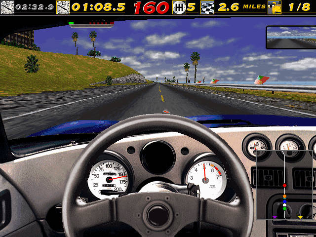 So, khm, here comes the part I didn't want to get into at the beginning of the post. Maybe I had too high expectations (I was mostly used to NFS3 and later ones, after all), but it was a disappointment. I mean, graphically it's fine, it's about what I expected from a game of this age, sound is cool too. But physics. Oh my. More like a lack of it. I get it, you had a 75 MHz processor, and you had to squeeze into it a software 3D renderer, AI, sound, and a physics engine. Compromises had to be made. And while I understand it was better than what most other games at that time could too, it's still the age of racing games, where you stay exactly in the line or everything breaks down. And in addition to this, ridiculous amounts of hidden walls. Practically there's a hidden wall along the edge of road, but it's a bit random. Sometimes you can't even get close to the white line signaling the end side of the road, and sometimes you can go into the dirt next to the road, but still hit an invisible wall halfway between the side of the asphalt and a fence running along the track. And the interaction with wall, whether it's visible or not, is a massive slowdown. Even though there's no damage, you don't want to hit walls in this game. Plus the AI, it was annoying in NFS3/4, but here it's a special kind of nightmare. In the NFS4 review, I wrote the following about the AI: