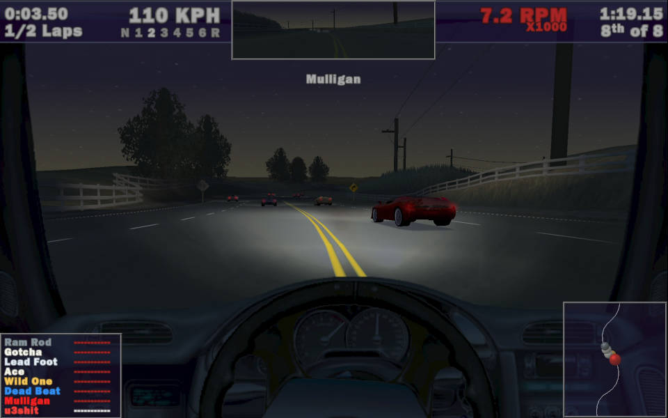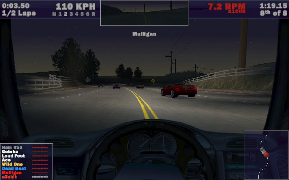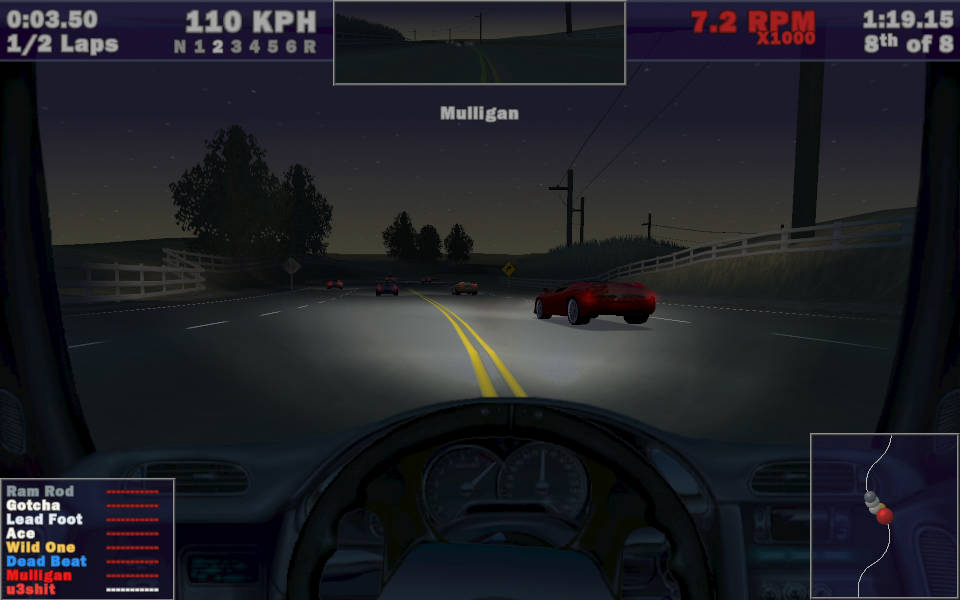 OMG. NFS3's software renderer from 1998 in 1920x1200 resolution at stable 60 FPS! Also with software renderer the headlight option is disabled and you only have vertex, but frankly, looking at the output it's somewhere between vertex and projected. Note how opponent cars and lane markings (and also dashboard) are fullbright, making night races way easier. This probably also explains why I didn't remember the game so dark when I played it as a kid, as I used the software renderer back then...