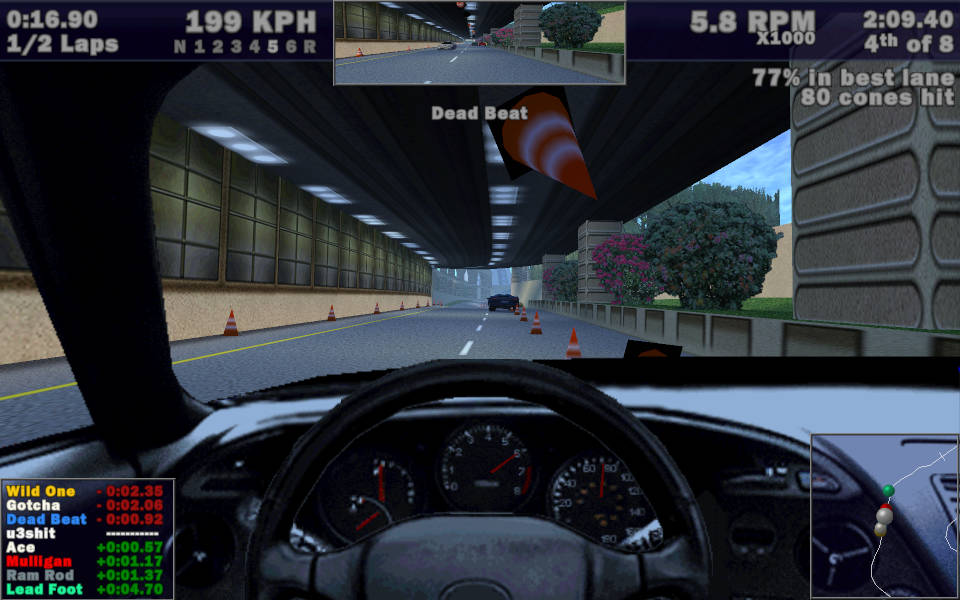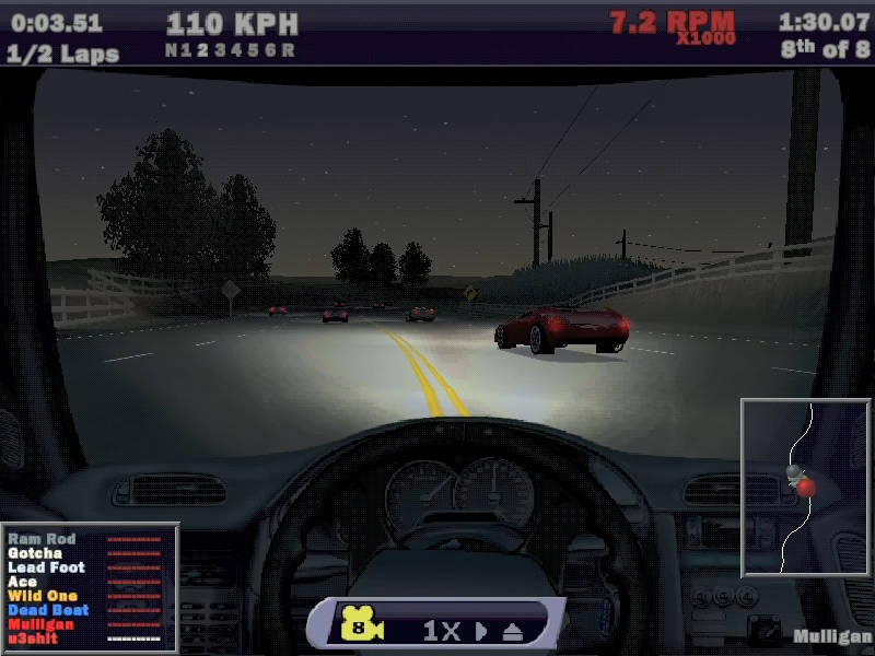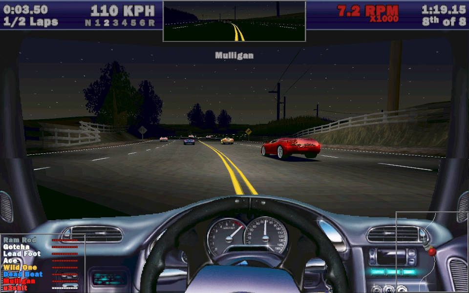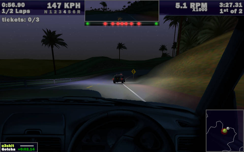 (Look at those lighting effect with the pursuit cars! For example, around 1:10 or 7:15. How it lights up the dashboard or the surrounding environment, even visible in the rearview mirror. In 1998! Don't ask why the dashboard doesn't have lights... Or see the very effective roadblock in action at 3:20. Also see 9:27 for a near-catch, showing your about only option here, press the gas pedal and hope you can somehow get out of the situation. If you brake, you lose.)