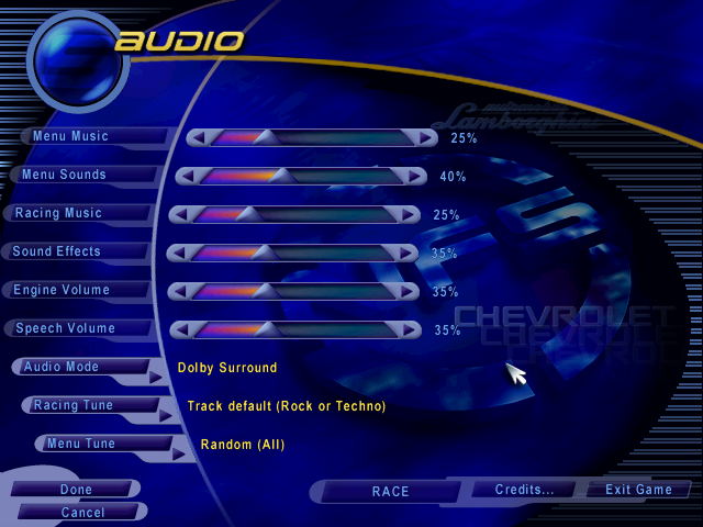 The first thing you can notice is the EA logo is the same as in NFS2. Huh, did the annual EA logo redesign team slack off and couldn't complete a new logo on time? But then, hey, Dolby Surround©®™ (I hope I didn't miss any character, I don't want to be sued by Dolby Laboratories for misrepresenting a 42 years old technology)! (Also, was that video digitized from VHS? Part of the bottom row is missing...) You can connect the stereo output to a Dolby Surround compatible receiver, and have surround sound! Maybe. The first and only NFS to have this feature. More on this later in the technical shit part.