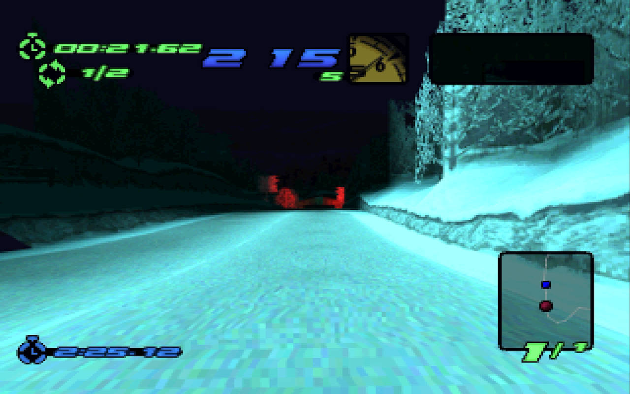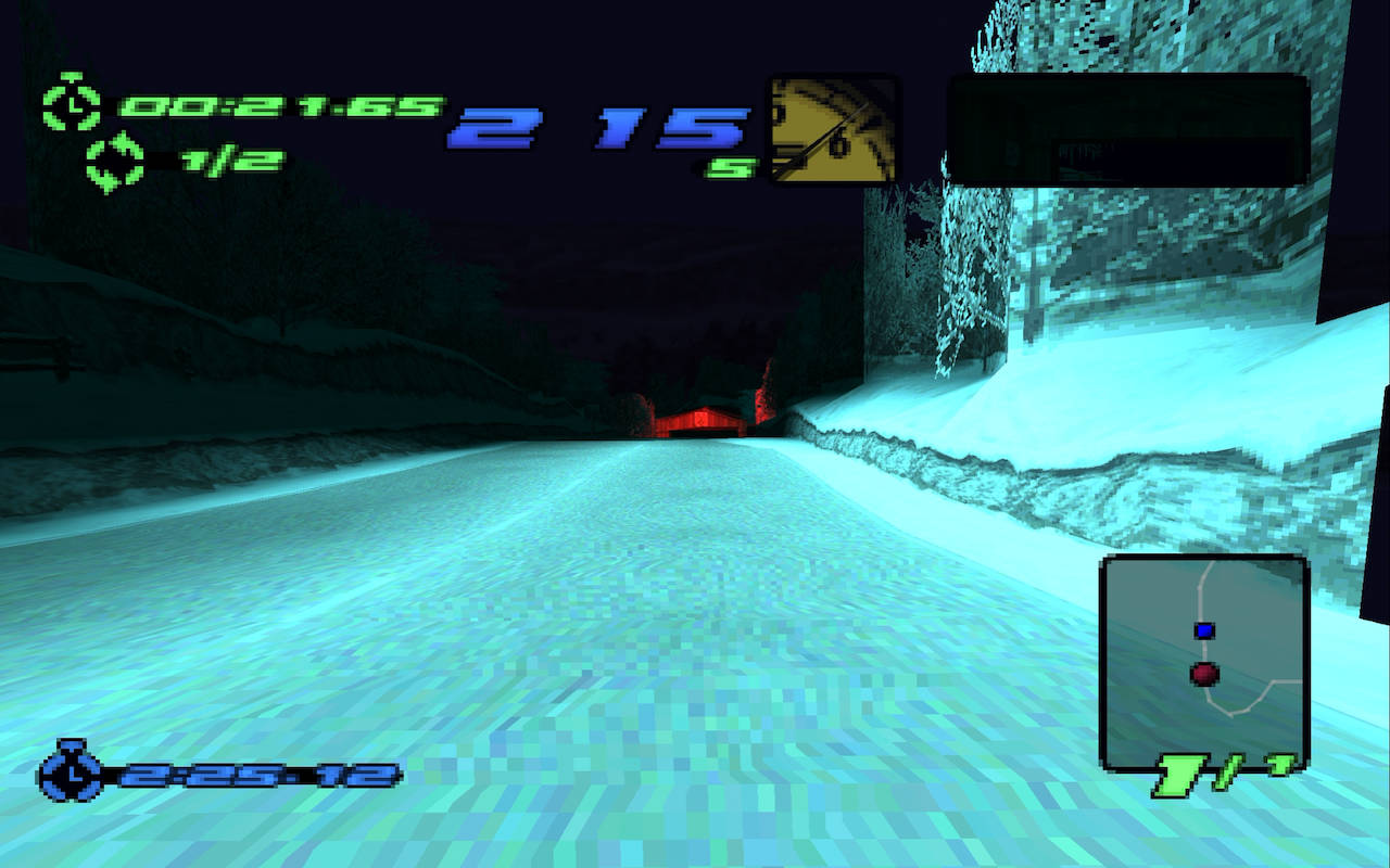 Night driving is horrible in this game, unless you fuck up your gamma settings, you won't see anything further than 2 meters in front of you. You don't have light cones either, just a very sharp line perpendicular to your viewport, whatever is nearer than it is visible, everything else is fucking dark. And in police mode, if you enabled the CPU overclocking, the police sirens will go a bit crazy, but I still take that over the slideshow I get without overclocking. I mean, this is what you have in DuckStation without overclocking: