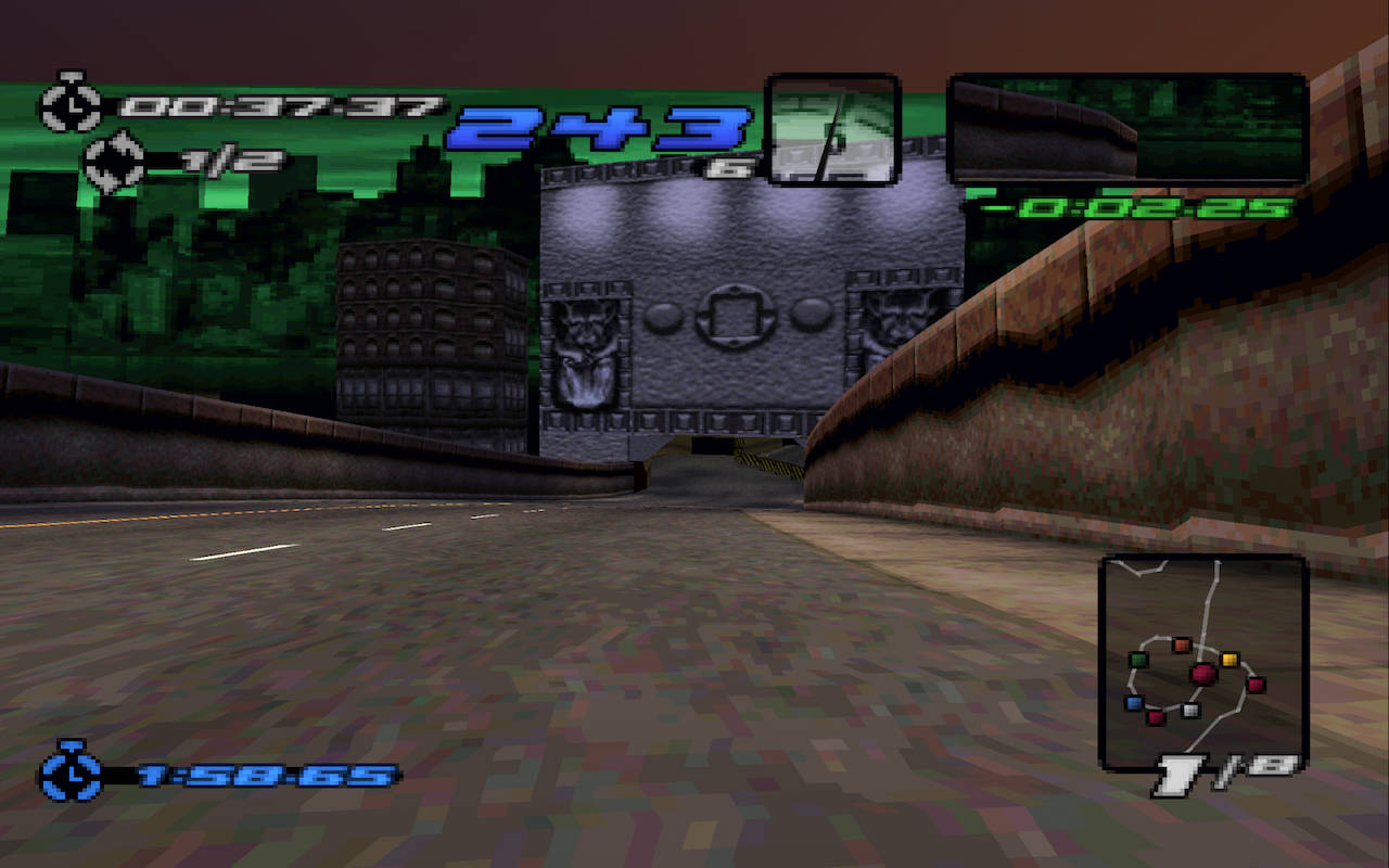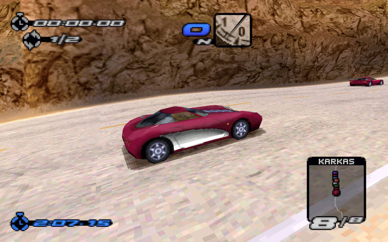 I'll try to summarize the differences here, this post is already too long. First is, handling. It handles wildly differently than the Windows version, to be honest, it's closer to NFS2. Simulation mode is pretty bad, your cars are almost accelerating faster than braking, and you have the weird binary grip-or-slide thing from NFS2, except it's a bit less noticeable and harder to do slide consistently. And when you fail to do it, you'll end up in the wall, because these cars need a kilometer to stop, and almost none of them have ABS (not even the super futuristic bonus car!). Oh, and usually all you need is a little nudge to flip your car over! At least, it lands on its tires after done spinning, most of the time.