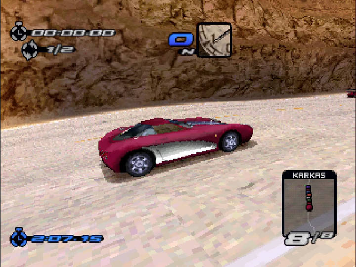 The HUD is also simpler than the Windows version, no opponent list, no non-rotating minimap, the finish line is marked with a single green pixel next to the track. But instead you can set map to radar mode, which means just hide the track from the map and zoom the fuck in. Might be useful to see better who is around you, but then you lose the map. After finishing the race, you can view a replay, but not save it for later, like in NFS6. On PC, even the original NFS1 had savable replays. Ghosts and knockouts are also unsavable. In short, this game feels like NFS3 running on NFS2 engine.