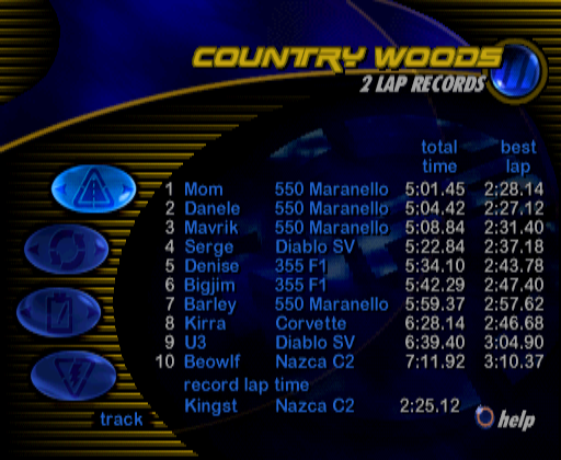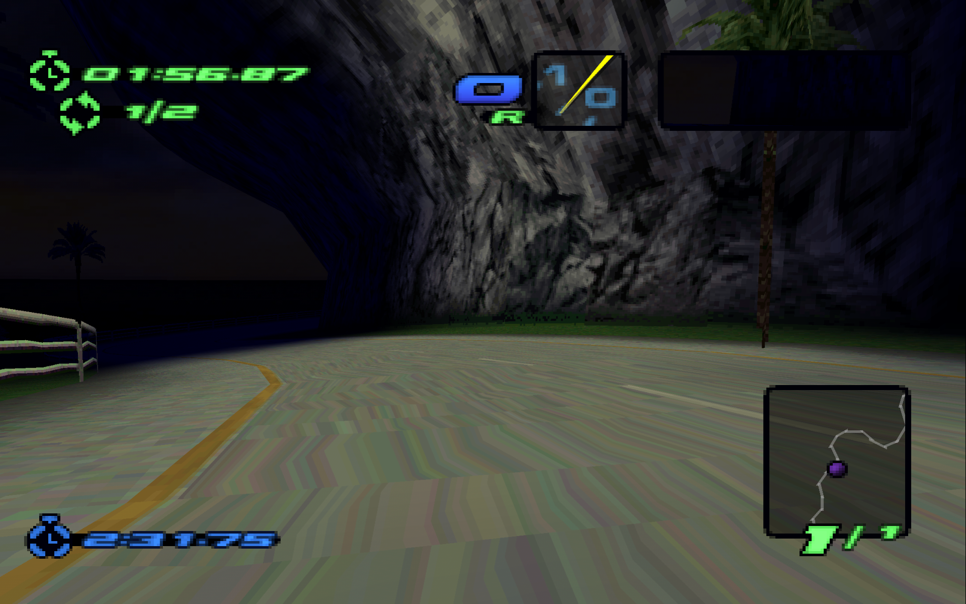 I'm not going to lie, the main reason I tried this game was the hidden tracks missing from the Windows version. I kinda played them using mods for NFS4 (1, 2, 3, 4, 5), but I wanted to see the original. Also TR02B! But not so fast, the normal hidden tracks first. You can only unlock them by entering their respective cheat codes as player names, and it's a major PITA with NFS3's two button input method. And you have to redo it after each reboot of the game, since this is not saved with your setting unlike other, normally unlockable items. The tracks are: