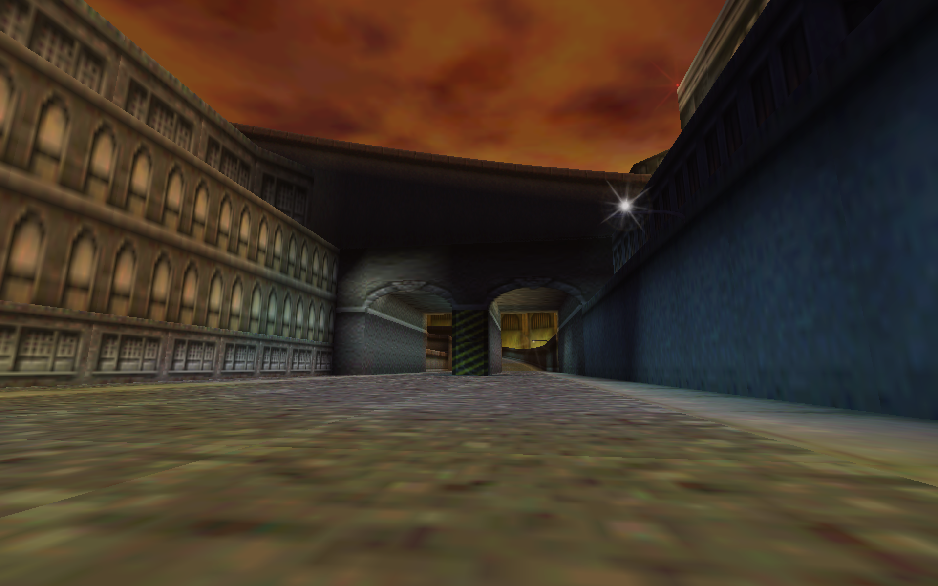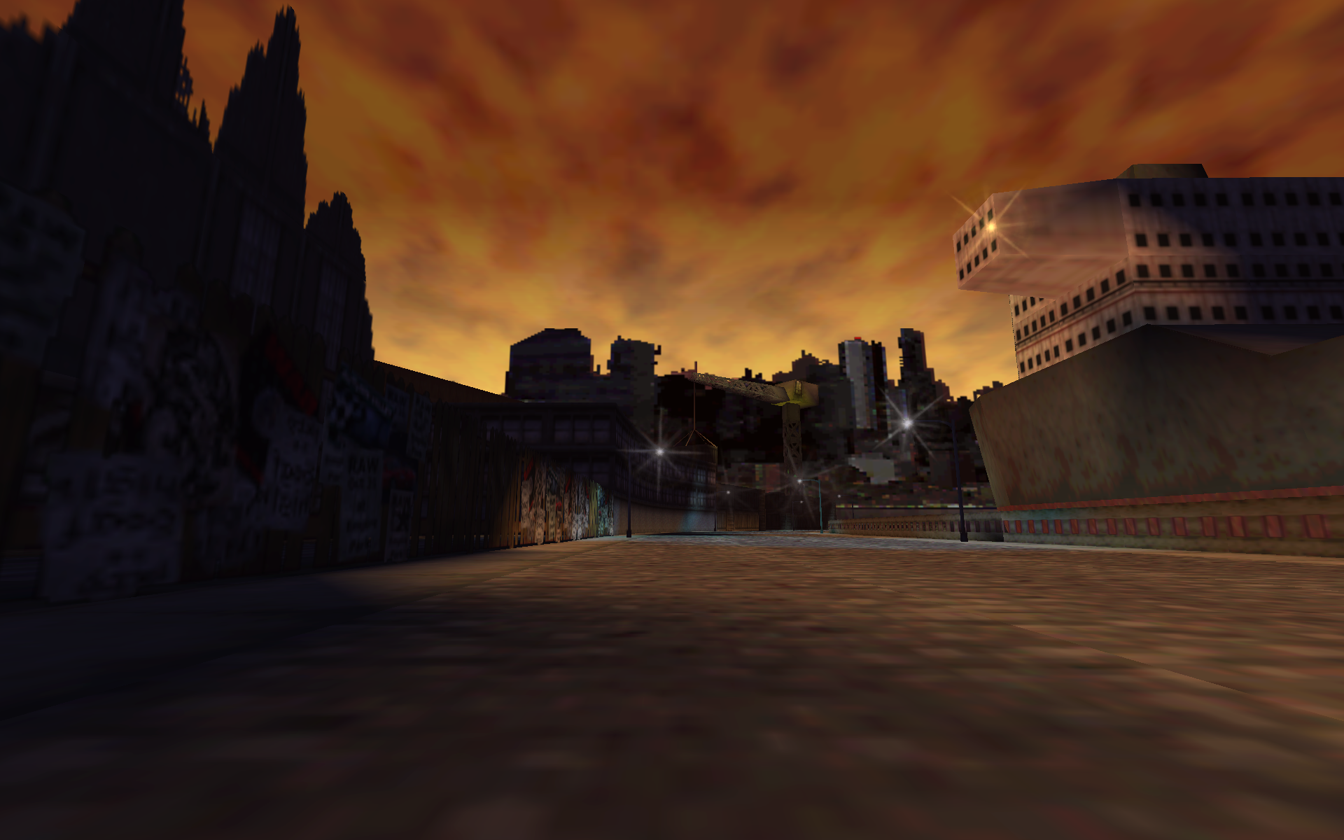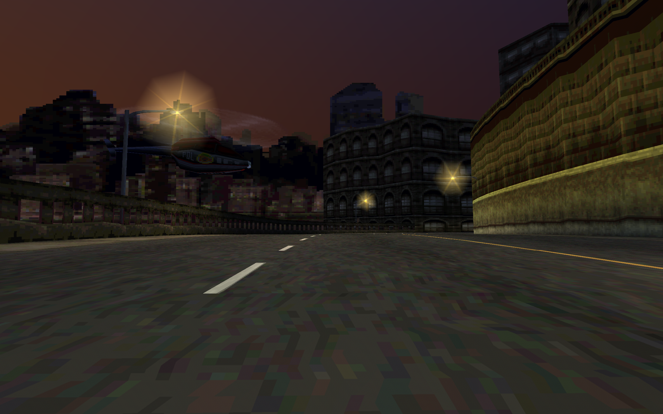 The main difference here is the skybox. The Windows version has an orange cloudy (or more like Perlin noise) skybox, with some silhouette of a city between the track and the skybox. In the PS version, the skybox is just a gradient, and the silhouette is more visible (probably to hide the ugly skybox). The textures use nearest filtering in PS, so everything looks blockier even if the 3D geometry has the same resolution. The lights also look different (yellow instead of light, and bigger, probably to compensate for the missing resolution on normal PS), and the general lighting of the track is also a bit different. Onto TR02B, I think this is the only case in NFS3 where the second, more advanced track is actually brighter than the normal, but this might be just because it's unfinished... The sky is also weird, I think it was supposed to be green, but the brownish gradient remains, and the city silhouette is lacking an alpha channel instead, and it has a green sky with clouds. I think they wanted to have clouds in PS Empire City too, but they ran into the limitations of PSX, so they scrapped it.