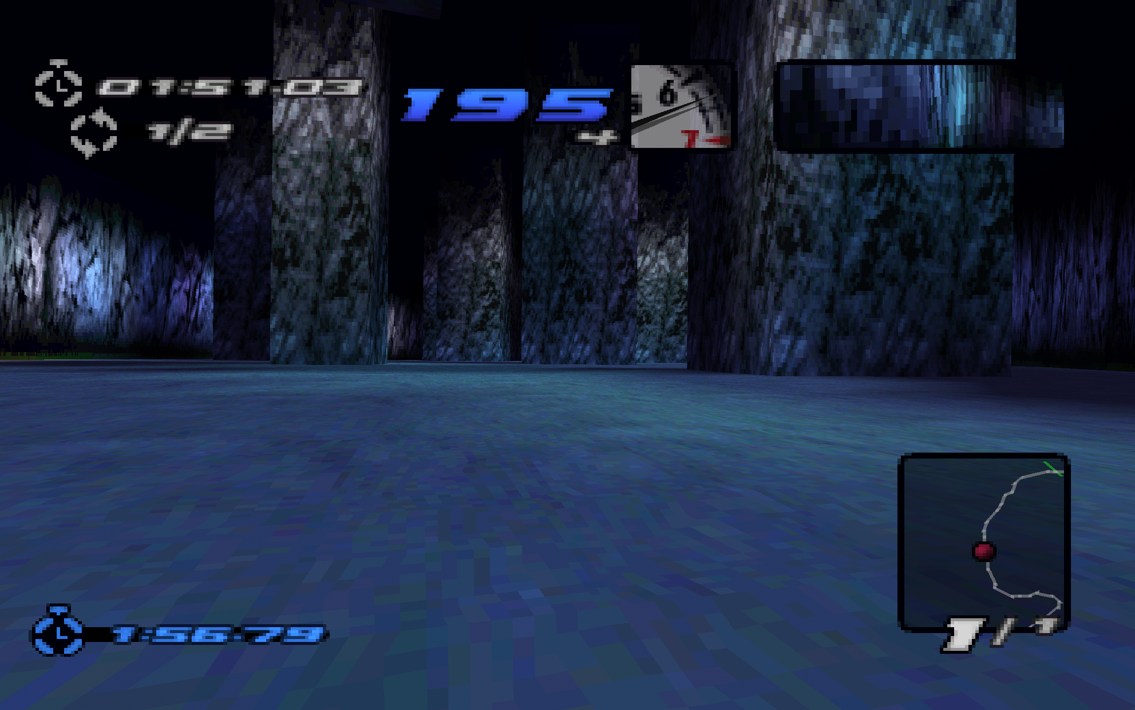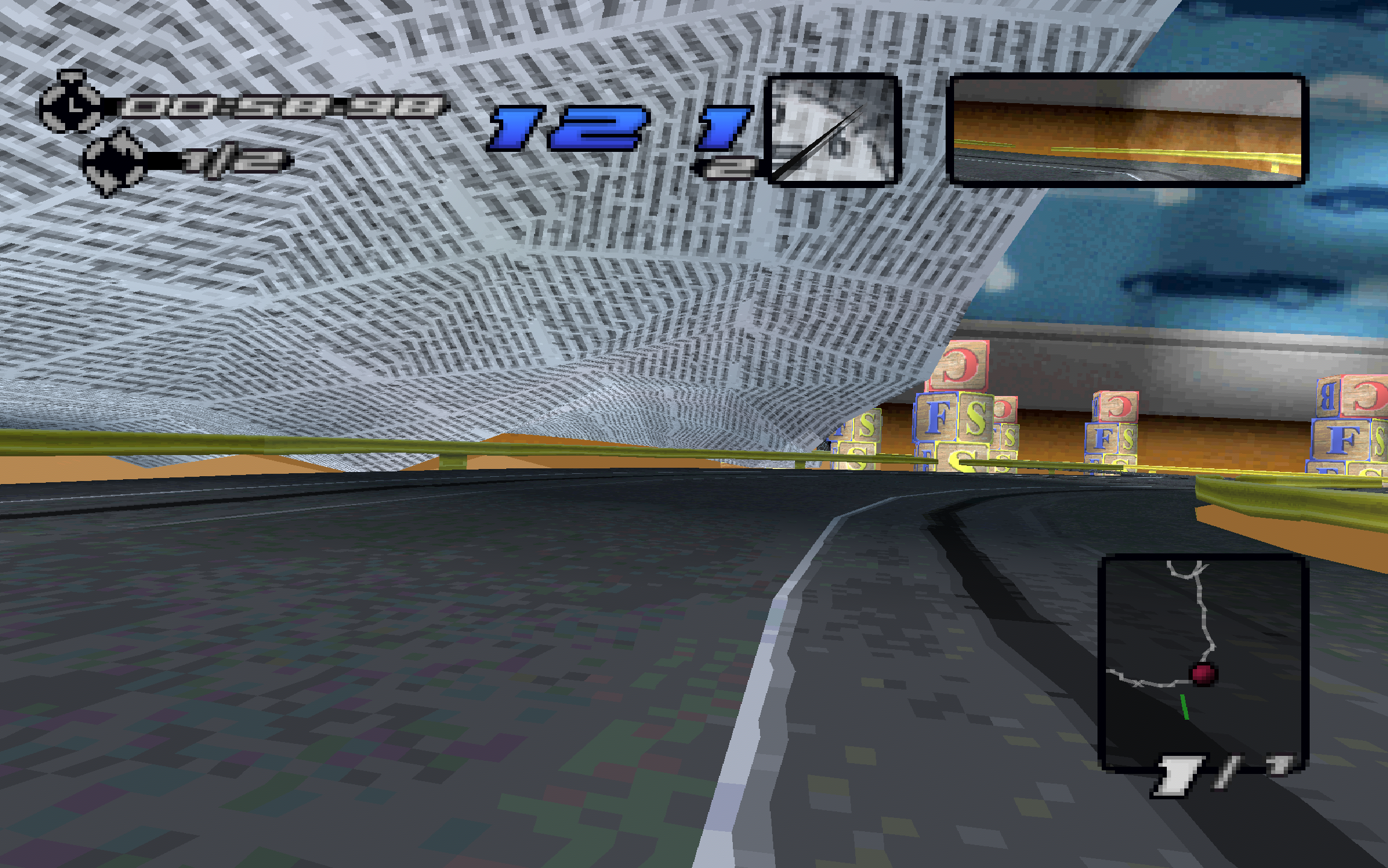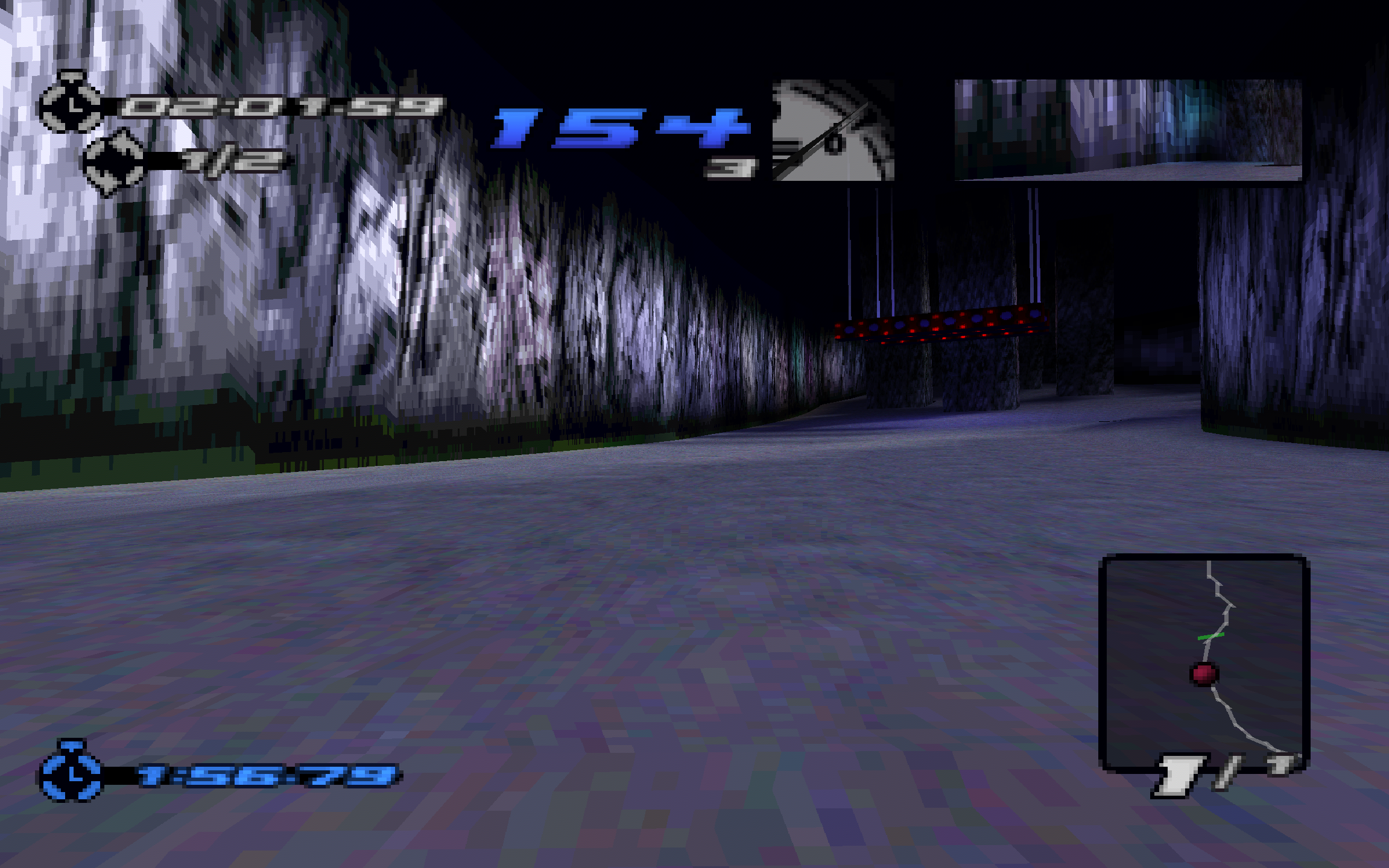 And now, the dessert, TR02B! So hidden it doesn't actually have a "real" name, TR02B is just the filename of the track on the CD. And it's unfinished, there are holes in the geometry, there are placeholder items, AI goes crazy at places. It starts at the same place as Empire City, so likely they wanted it to have a sister track like all other track pairs, but they scrapped the idea—most likely they couldn't finish it on time, and they forgot the files on the CD.