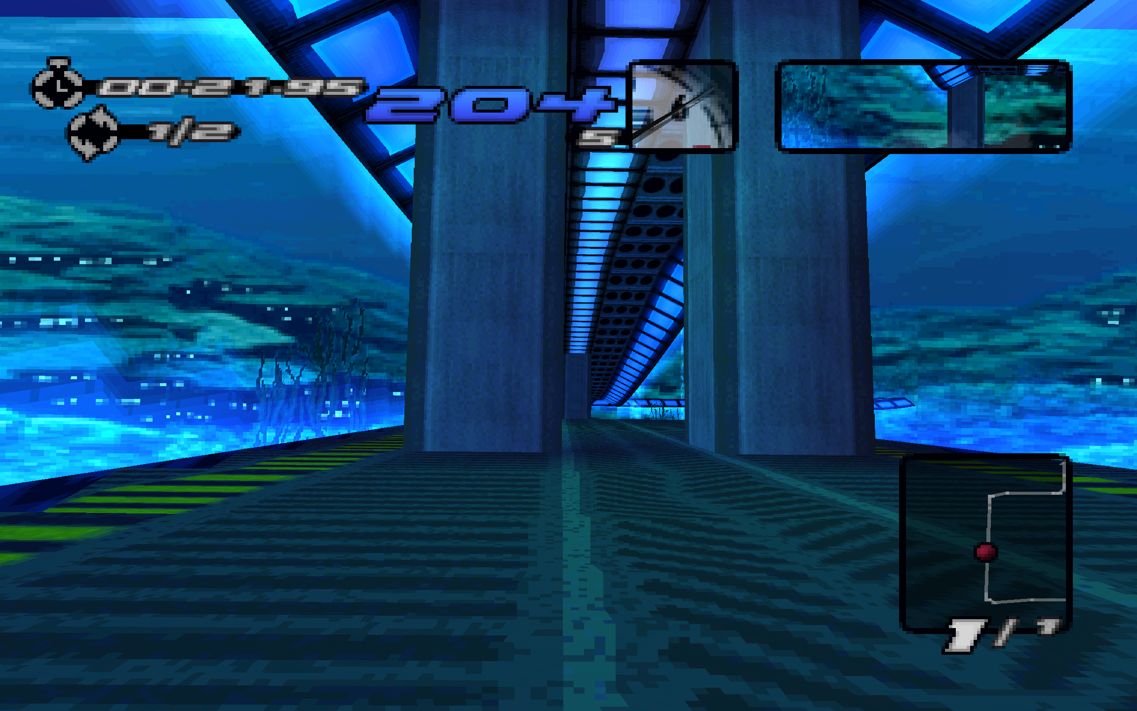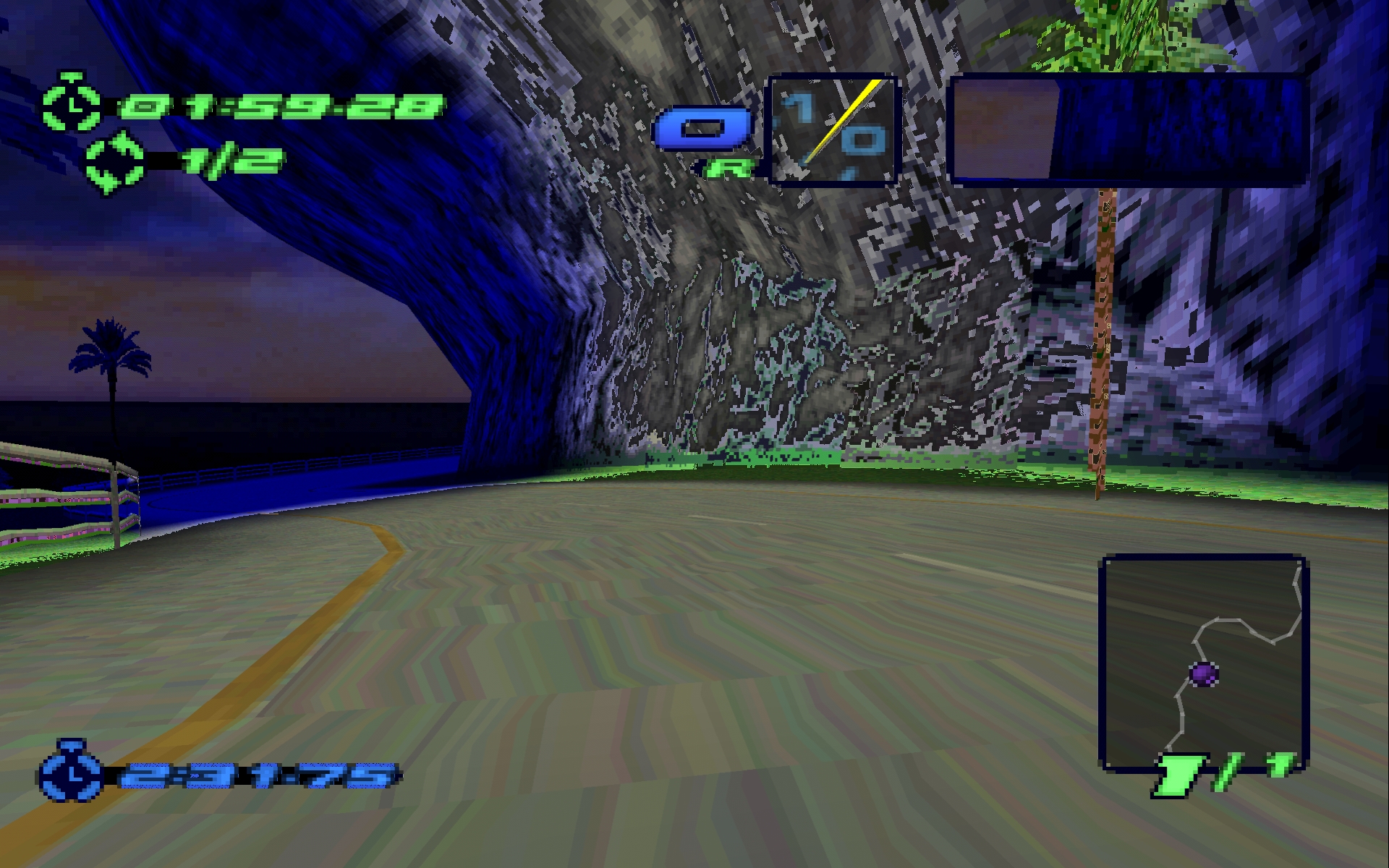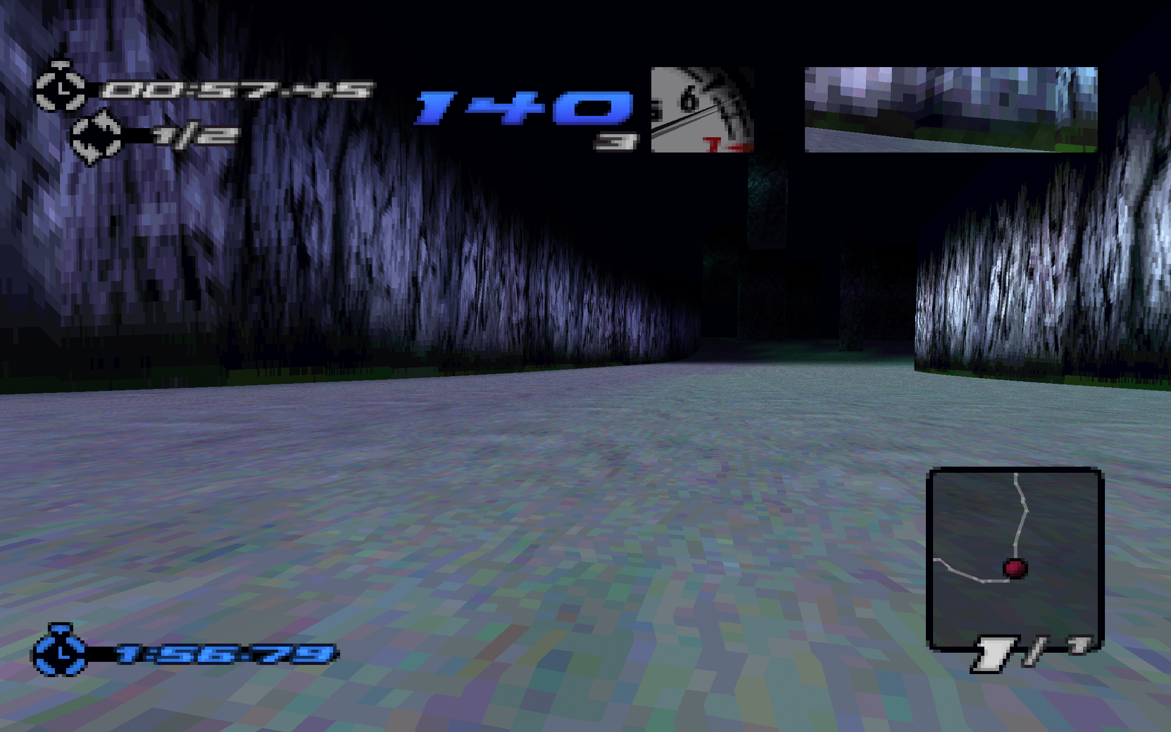 And now, the dessert, TR02B! So hidden it doesn't actually have a "real" name, TR02B is just the filename of the track on the CD. And it's unfinished, there are holes in the geometry, there are placeholder items, AI goes crazy at places. It starts at the same place as Empire City, so likely they wanted it to have a sister track like all other track pairs, but they scrapped the idea—most likely they couldn't finish it on time, and they forgot the files on the CD.