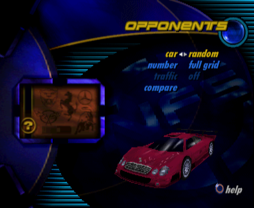 Finally, you can select your opponents in single race and hot pursuit mode. There's no class system in this game, when you have a single opponent, you select his car (no random), when racing against a full grid, you can have the same car for everyone or random. When not racing against a full grid, you can have traffic, but unlike the Windows version, you can select the traffic intensity.