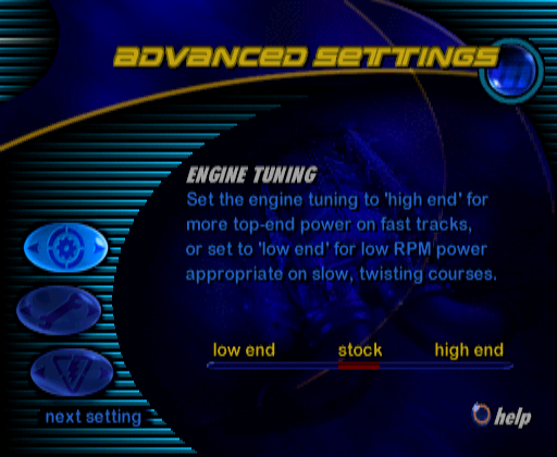 The HUD is also simpler than the Windows version, no opponent list, no non-rotating minimap, the finish line is marked with a single green pixel next to the track. But instead you can set map to radar mode, which means just hide the track from the map and zoom the fuck in. Might be useful to see better who is around you, but then you lose the map. After finishing the race, you can view a replay, but not save it for later, like in NFS6. On PC, even the original NFS1 had savable replays. Ghosts and knockouts are also unsavable. In short, this game feels like NFS3 running on NFS2 engine.