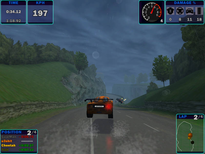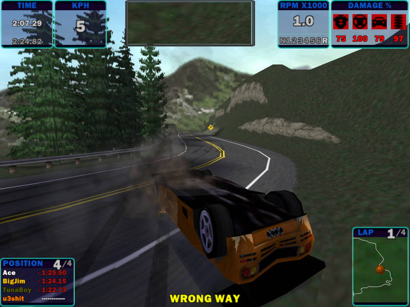 NFS4 generally follows the footsteps of NFS3, instead of changing everything possible, like it was the norm with the later NFS editions. It includes the tracks from NFS3 as a bonus (but not the track-specific music, which makes them sound really weird the first time you race them; also, handling is quite different than in NFS3, so you'll need to race them a few times to get used to them), but not the cars. Two new big features we have here is a (very basic) damage model, and a career mode. (And the third novelty is related to the pursuit, see below.)