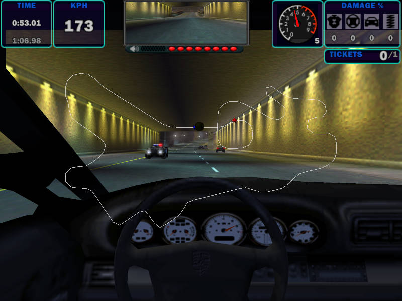 Now onto the tactics. You have to stop the cars 6 times before they finish to win. The opponent's class depends on your car's class, and generally I found it easier to go with the most basic Pursuit Corvette, so if you have to switch to another cop car, it won't be totally hopeless. What worked for me is to turn on the siren as soon as the race starts, wait until the game locks on to an opponent, then hunt him down. When done, instantly turn back the siren (the game automatically turns it off), and stay with him, you can even try to stop him. There is a cooldown after a ticket, 10 seconds, give or take, while you can't pursue and ticket him, but as soon as it expires, you're good to go again. I think there should be a minimum speed limit the opponent has to reach before you can initiate a pursuit, but this never caused a problem for me, maybe it's a bit buggy after a ticket? Whatever is the case, just ticket the poor guy until he's arrested. Now onto the harder part, namely finding the other racer, which likely means switching to a crap car, and also stop him as soon as you can. Generally the AI can sometimes catch one of the racers, but don't expect the AI to give more than one ticket per race, so you still need to give 5 tickets. And since you have equal or worse cars than the drivers, it means one mistake, and you'll never catch up to the racers. If you stubbornly decide to continue going after them (which I did many times), you'll just lose a full lap or more just trying to catch up on them, and if you do it, you run out of time. You can't use reset go get near to them either. Instead, you pray you have a different cop car at a better place on the map, and if it fails, you're fucked. Technically you can turn around, race the track in the reverse direction and kamikaze the racer when you finally reach him, but I could never pull it off. Spike strip is as unreliable as in NFS3, if you drop them down with a bad timing, nothing happens, if they still manage to hit it, it will just slow them a bit. When you're the racer, a strip is final, no exceptions. When you're the cop, it's just a minor nuisance to the racers. Fuck this shit.