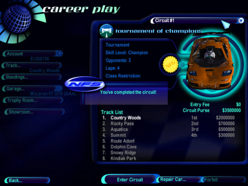 The UI is still as bad as with NFS3, you start from 0/I think the intention here was to unlock a car when you win all tracks, like in NFS3, but since I already unlocked every non-cop car from the Tournament, I didn't win anything.