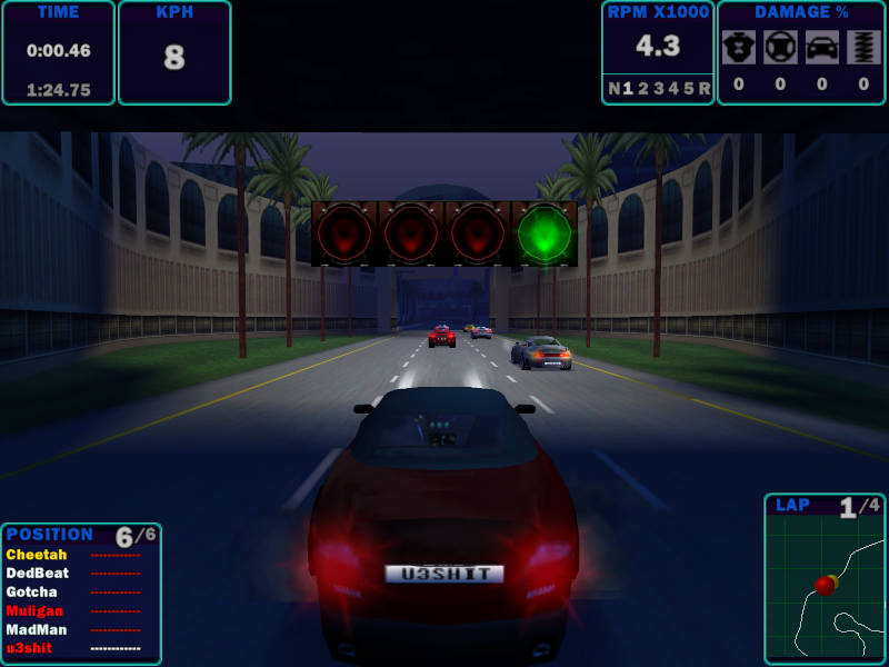 Tournament: This is how normal championships usually works, you have one or more tracks, the first to finish gets 30 points, the second 25, then 20, 16, 12, 8, 4, and finally 0 points for the 8th place. If the race has less than 8 entrants, you get points, even if you do not finish the race. Which brings us to a small observation, unless you suck at driving, by the time you get to the last track, you'll usually have enough points to win even if you finish last. So you can skip the last race, but you mustn't click on "Forfeit" in the main menu! Doing so will make you quit the circuit, without receiving any rewards. You have to start the race, wait for the countdown, then "Forfeit" the race from the pause menu. The game will consider it as if you finished last, but without spending time to actually finish the race then pay for repairs. (Also, if you want to cancel a circuit you entered for whatever version, you're better starting then immediately forfeiting the remaining races, even if it takes more time. This way, at least you'll get the reward for the last place, which usually at least covers the entry fee.)
