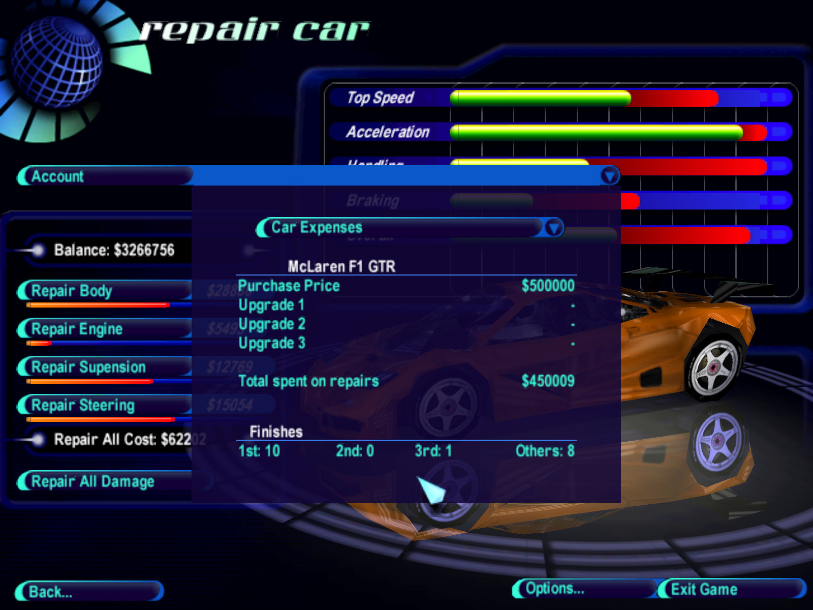 And while I'm at the annoying parts, let's talk about progression and difficulty in this game. You have four classes of cars, B, A, AA, AAA. NFS3 had C, B, A, I don't know why did they switch to this braindead reverse bra-size inspired shit. (Or maybe it's not reverse at all and we can agree flat is justice?) Anyway, in career mode you can upgrade most cars (AAA and bonus cars are not upgradable). Don't expect Underground-style customization, you just have upgrade level 1, 2 and 3, you can upgrade one by one, and you can't go back. Which is actually not too ideal, because of one thing: repair costs increase pretty steep with car (and class) upgrades. To be honest, unless the circuit was fixed to a single class, I played it one (or sometimes two) classes below for the most part, because the AI is shit (except toward the end), so you can easily win with a worse car, on the other hand you need shitloads of money to buy all the weird cars you need, because a lot of circuits have weird requirements to enter. And circuits only start to pay well at the very end of career mode, before you'll be constantly out of money.