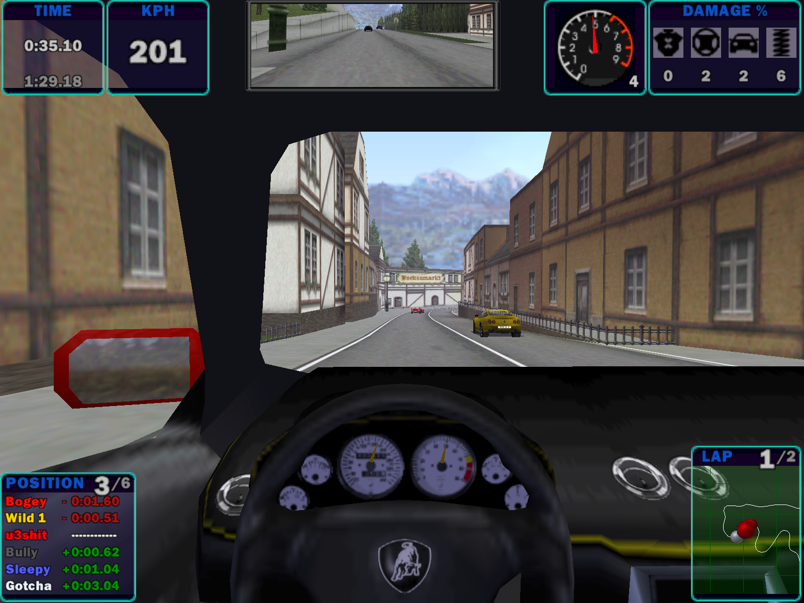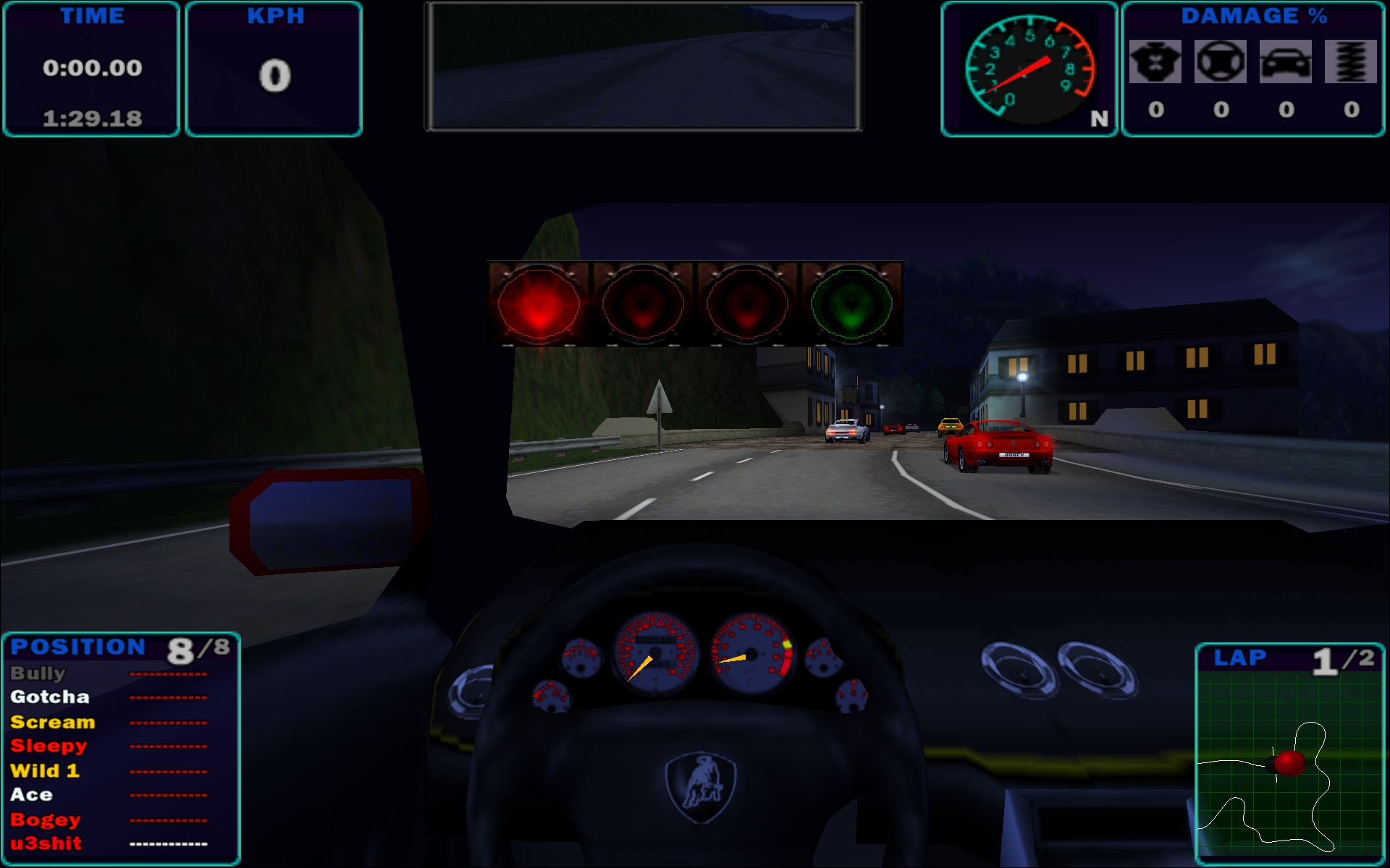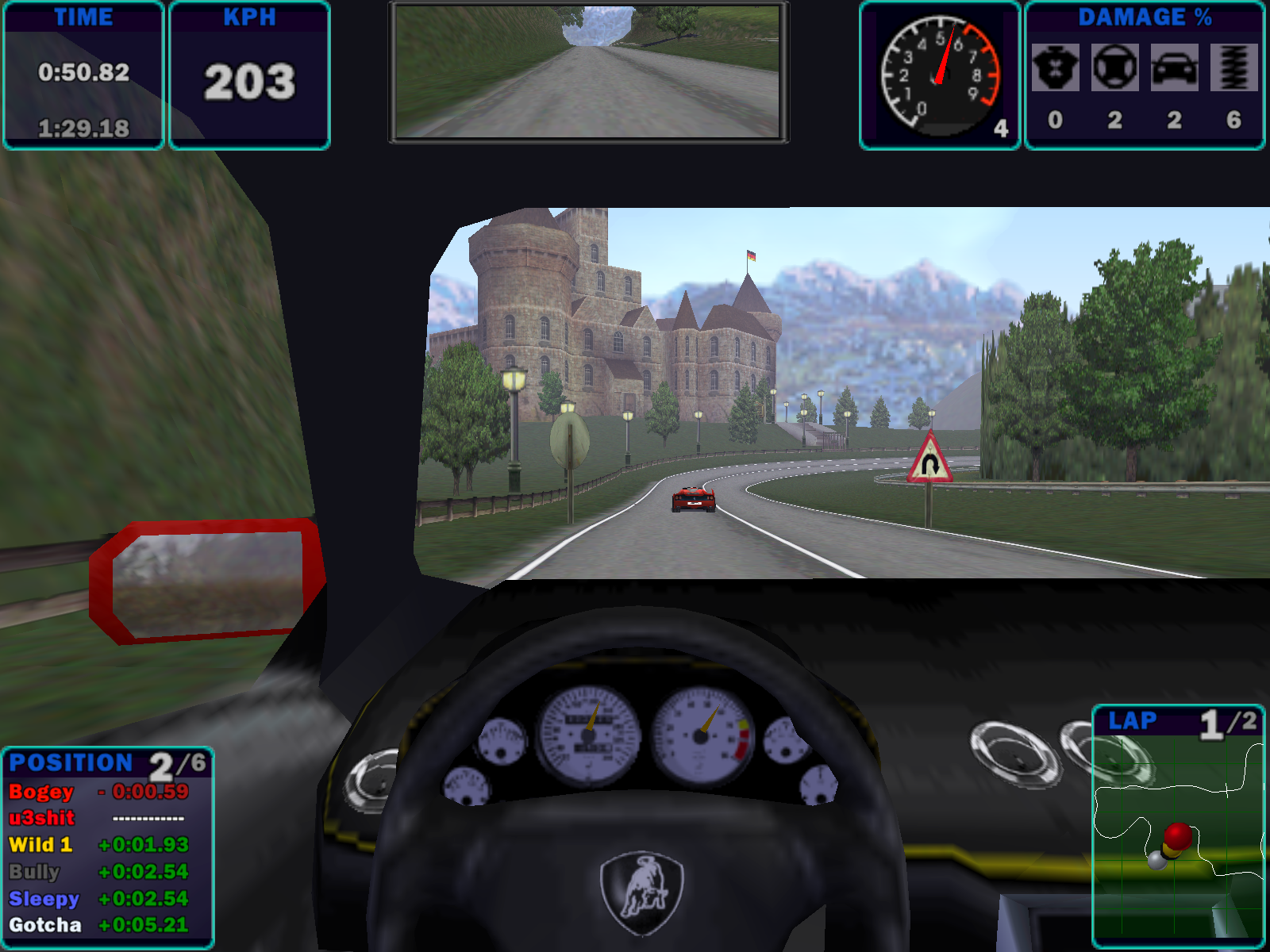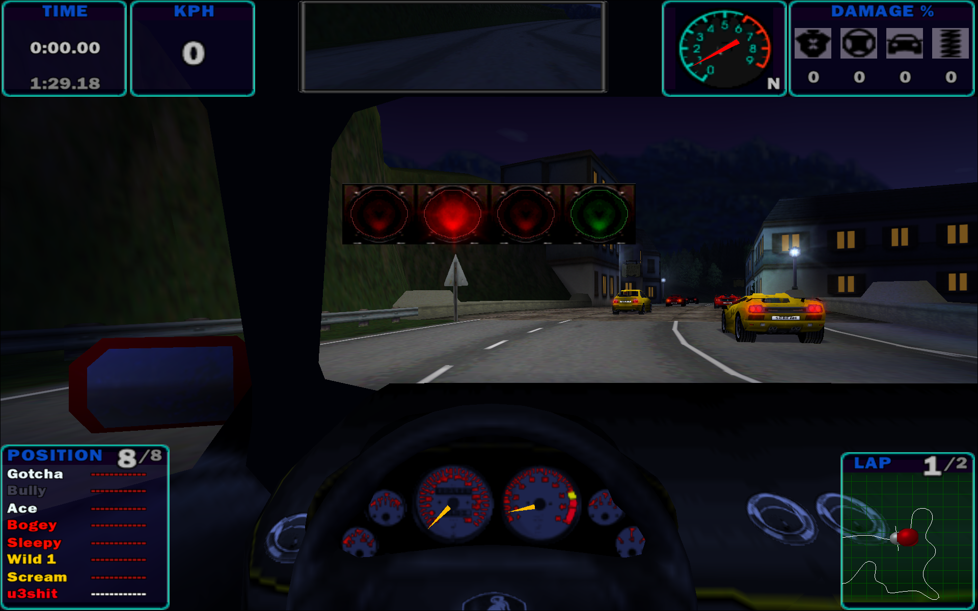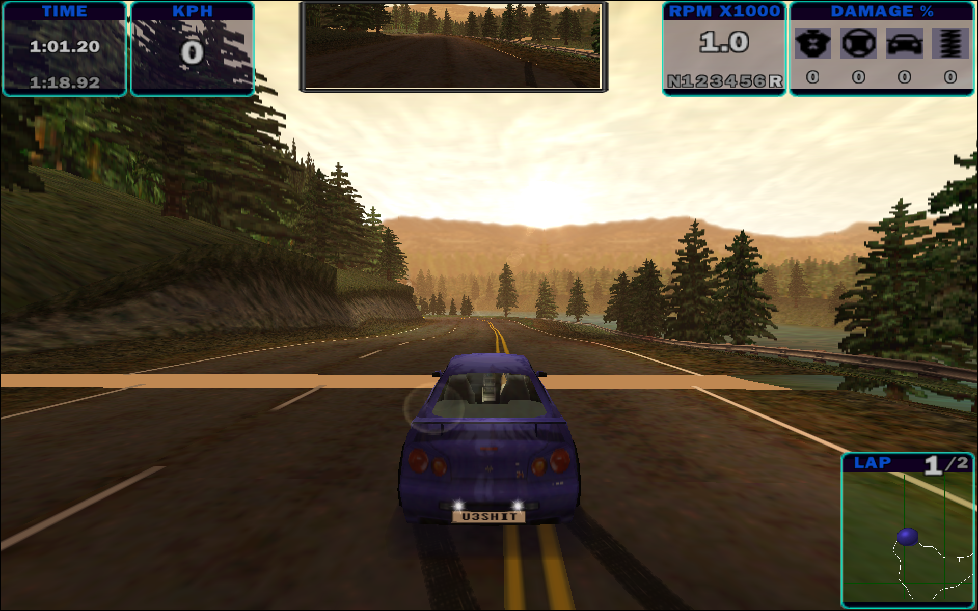 Tournament and Knockout: also pretty much the same as NFS3 (so you can manually save your state and restart races without messing around with your save files), except you have three difficulty levels here (Amateur, Pro, Champion). Completing the Champion one will unlock the rewards of the lower levels, so there's no point in playing on lower difficulties. Tournament unlocks all (non-police) cars in the game, while Knockout unlocks all(?) tracks. (The career mode unlocked the NFS3 tracks for me, so I only had to unlock the racetracks.)