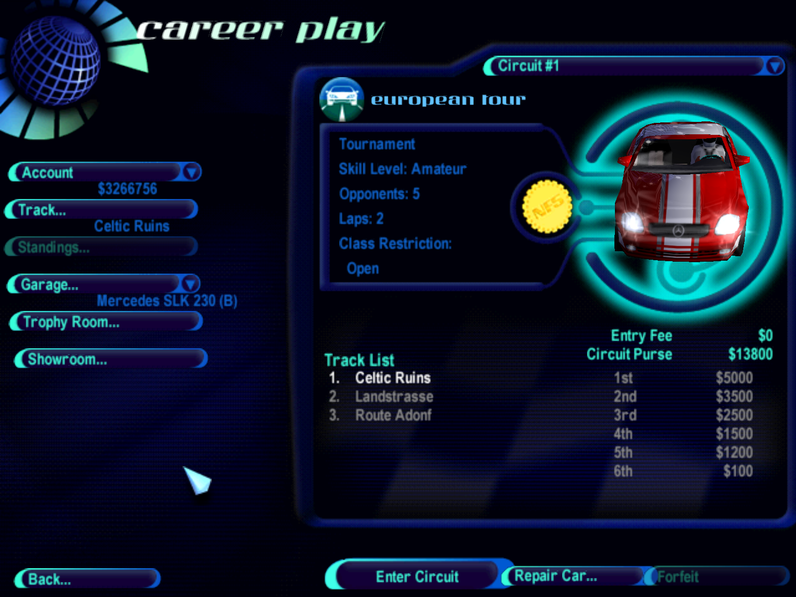 So, career mode. First, you start with $25000 and you have to buy a car from this, which means BMW Z3 or Mercedes SLK 230. I went with the Mercedes, since it has a bit better handling, and in my experience usually handling > top speed. After purchasing your first car, you can enter your first circuit.