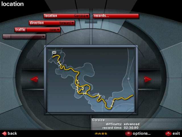 Before start, we get a map of the race. Already better than the PlayStation version! The game has a few tracks from the Windows version, but they're very rough approximations. I mean, this is how the map of the Corsica map shown in the video above looks in the Windows version: