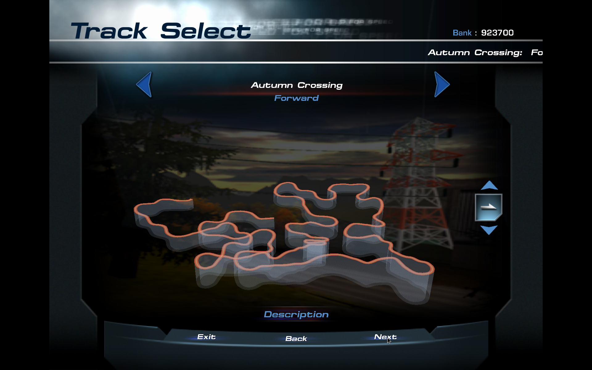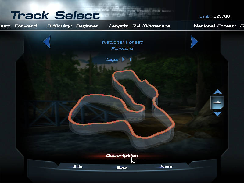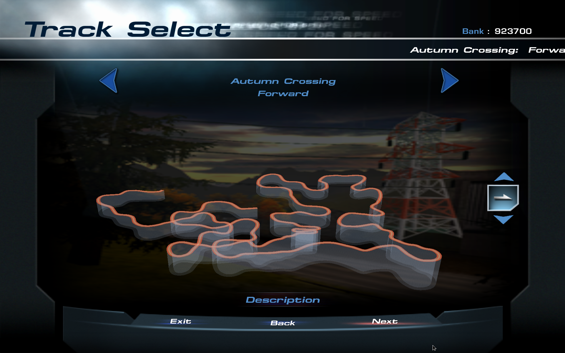 After the game modes, let's look at the track selection. Like NFS5, there are point-to-point and circuit tracks, but the point-to-point tracks are no longer the majority (⅔ circuit and ⅓ point-to-point). Like in NFS3, you have multiple tracks taking place in one location, but now you have 3 tracks at each location (2 circuits and 1 point-to-point). There are 4 locations in this game (so 12 tracks in total): Alpine, somewhere in the mountains of US, Medit (probably short of Mediterranean, I'm quoting the directory names of the tracks, these names don't directly appear on the track select screen), some Greekish location, Parkland, another USA location somewhere around the shores, and Tropics, some tropical island. So we're kinda back to the race around the world theme, but with another America focus again. Each track can be played forward or backward, and optionally mirrored, but unlike previous NFS games, you have to unlock these variations separately, and at the beginning you only have a few forward non-mirrored tracks unlocked. But at least you can have odd number of laps...