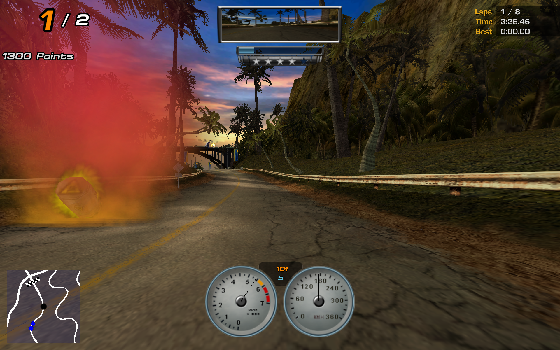 On tracks, you have lengthy shortcuts like in NFS5, but they're not marked on the map. Also don't expect the multi path madness you had on Auvgsomething. And I like the tropics location, especially where you have lava flowing under a bridge. It's just so stupid, something we don't have much lately. Also, you have track presentations back—kinda. Audio only, and just a general description of the track, like in NFS1–2, with barely any information to help you race the track. Sigh. Whatever...