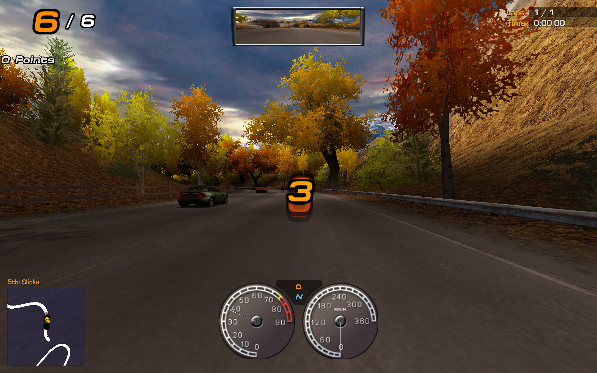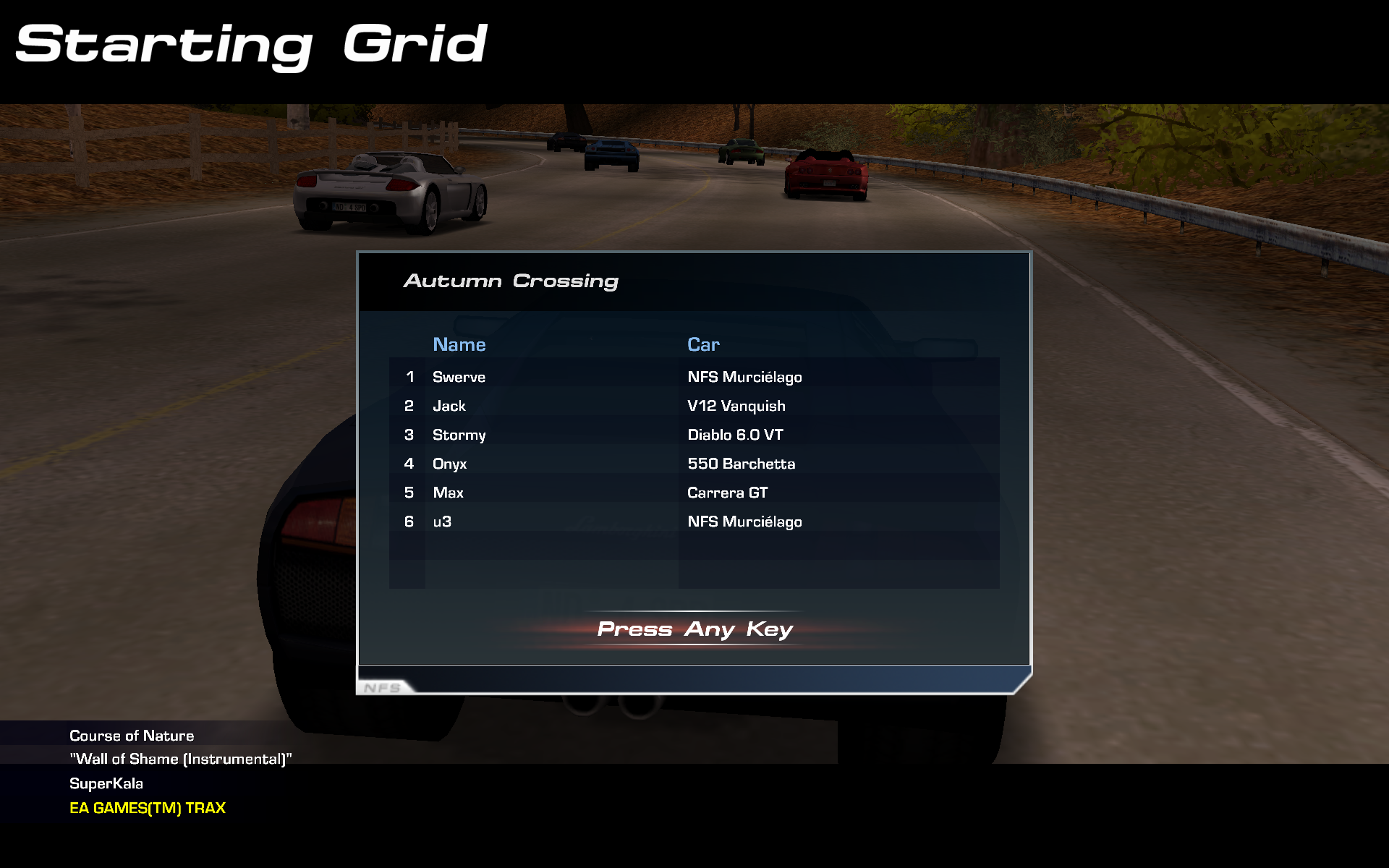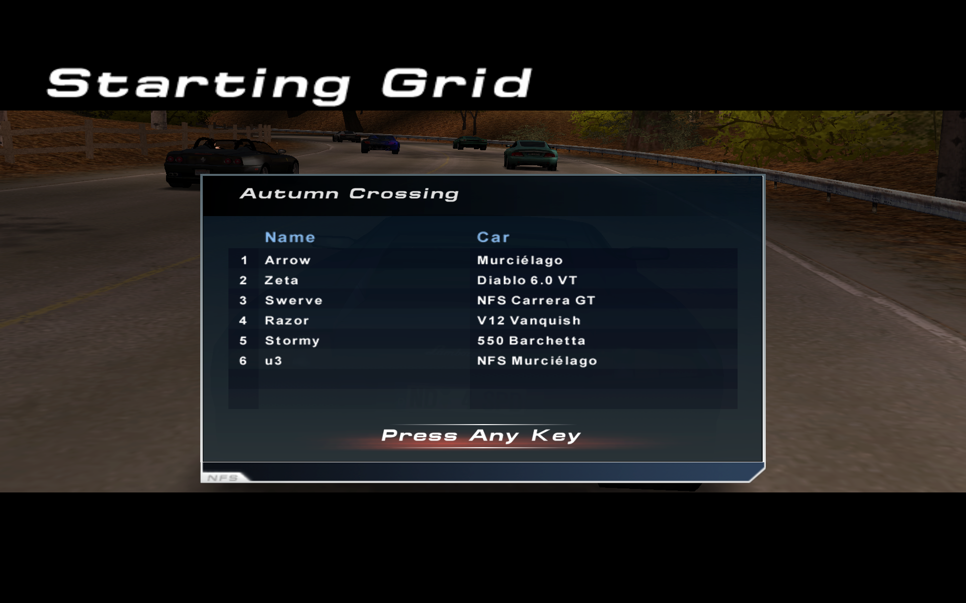 Lap Knockout: the new style knockout from NFS5—each lap, the last racer is eliminated. But unlike NFS5, eliminated players don't remain on the track. Also, in single challenge mode, you can select the number of opponents between 1 and 5, not just 1 or full grid as with single race.