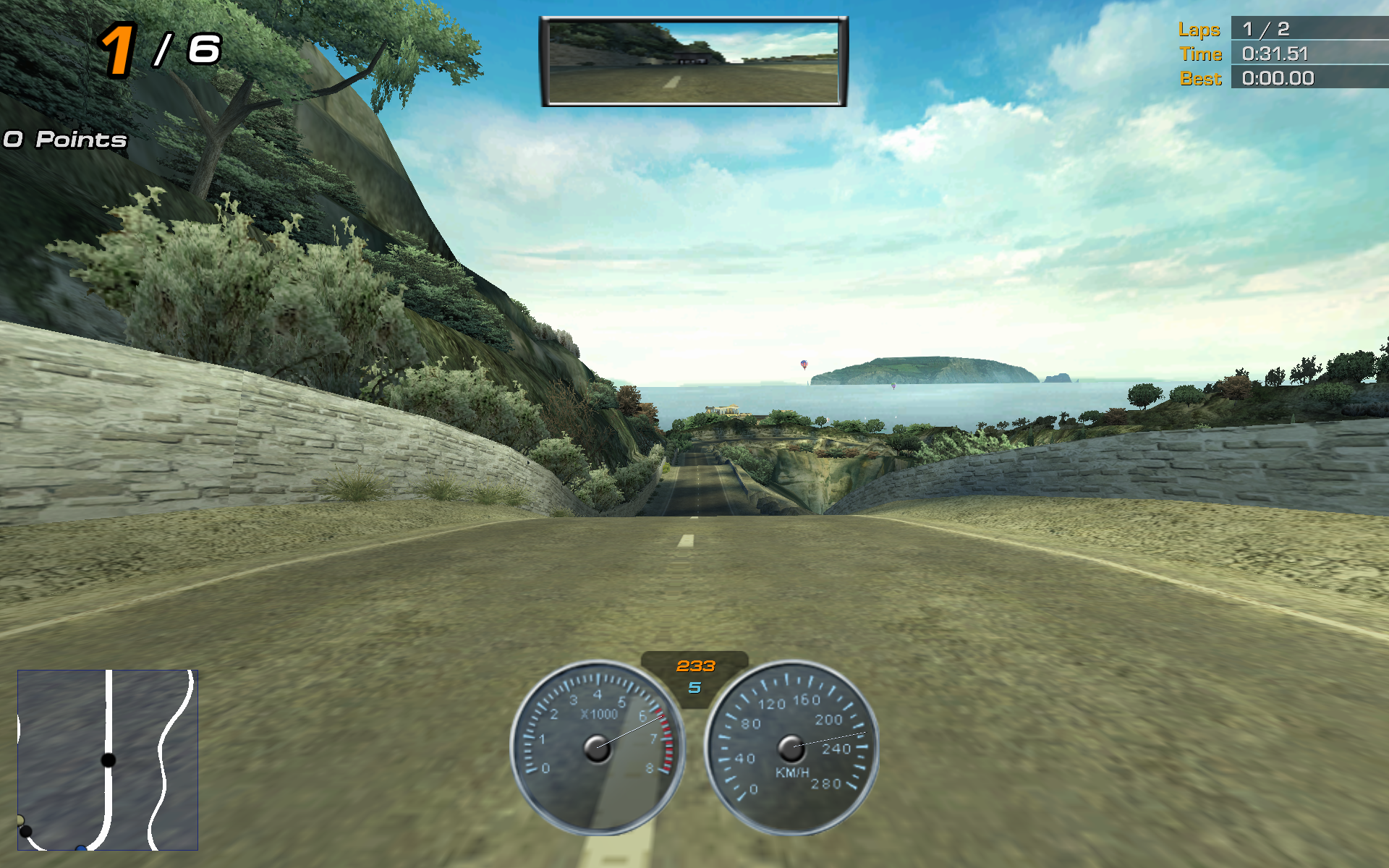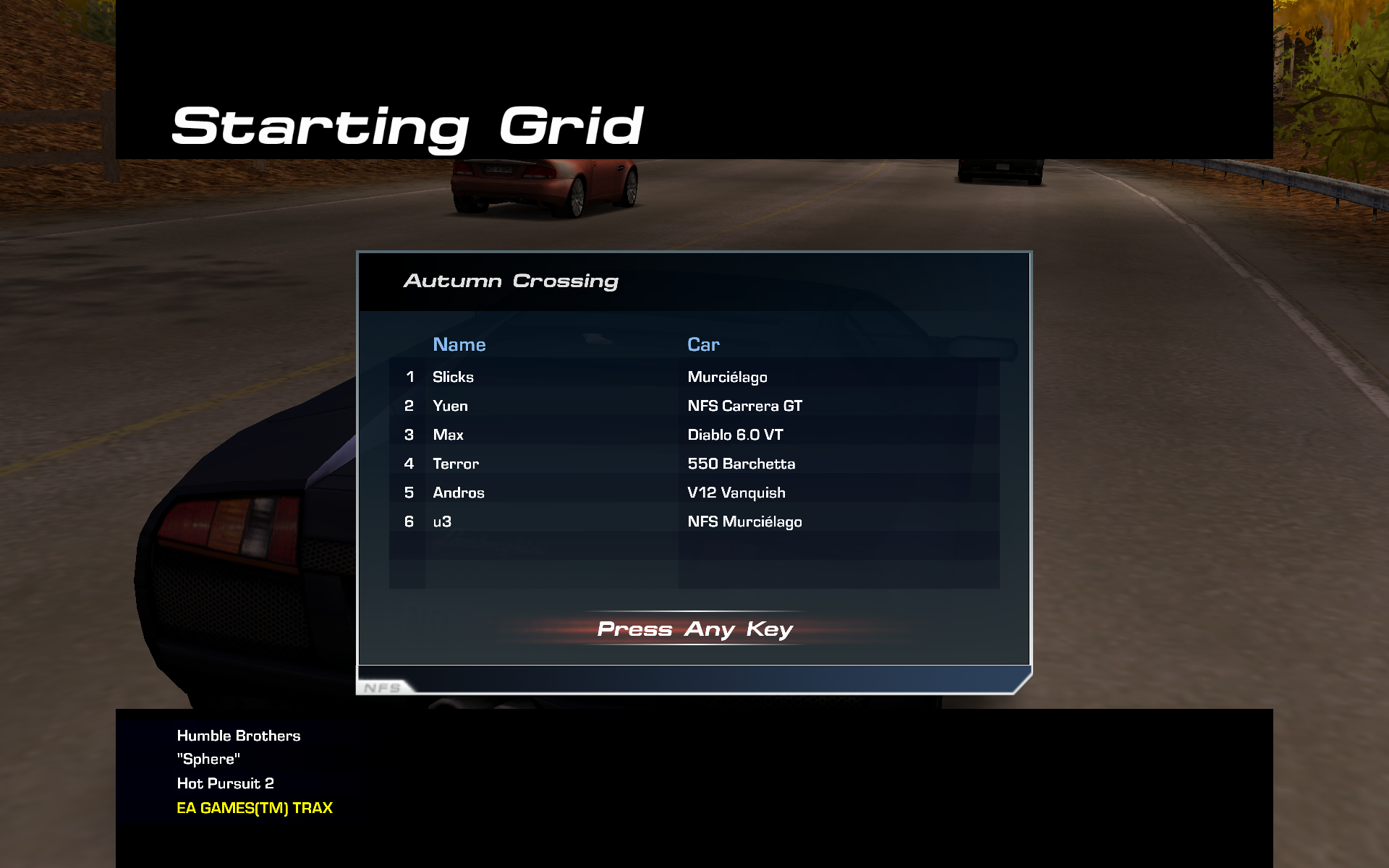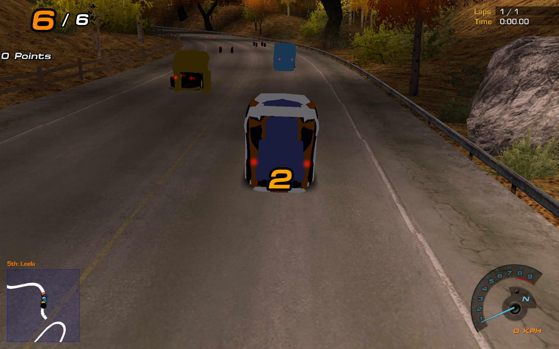 Lap Knockout: the new style knockout from NFS5—each lap, the last racer is eliminated. But unlike NFS5, eliminated players don't remain on the track. Also, in single challenge mode, you can select the number of opponents between 1 and 5, not just 1 or full grid as with single race.