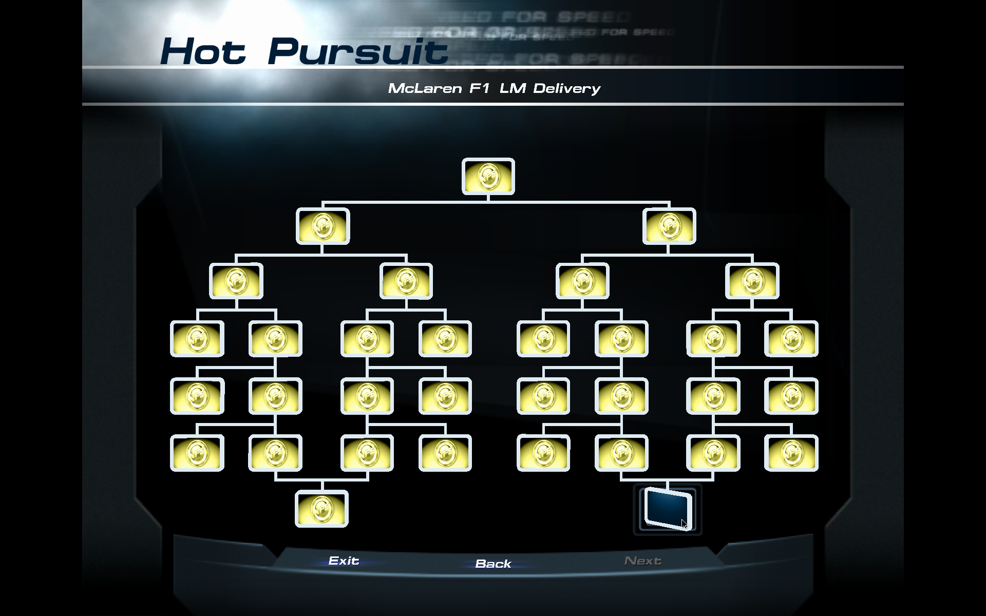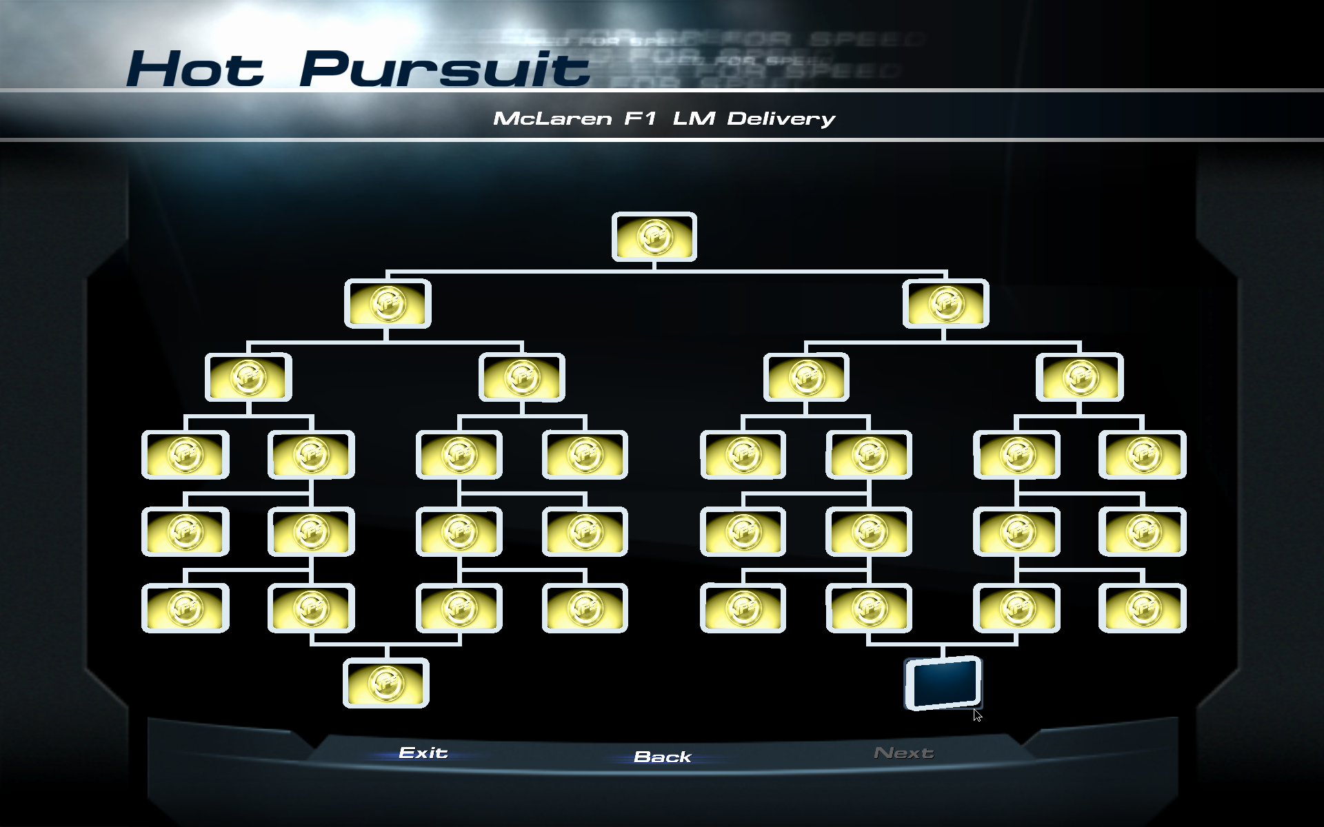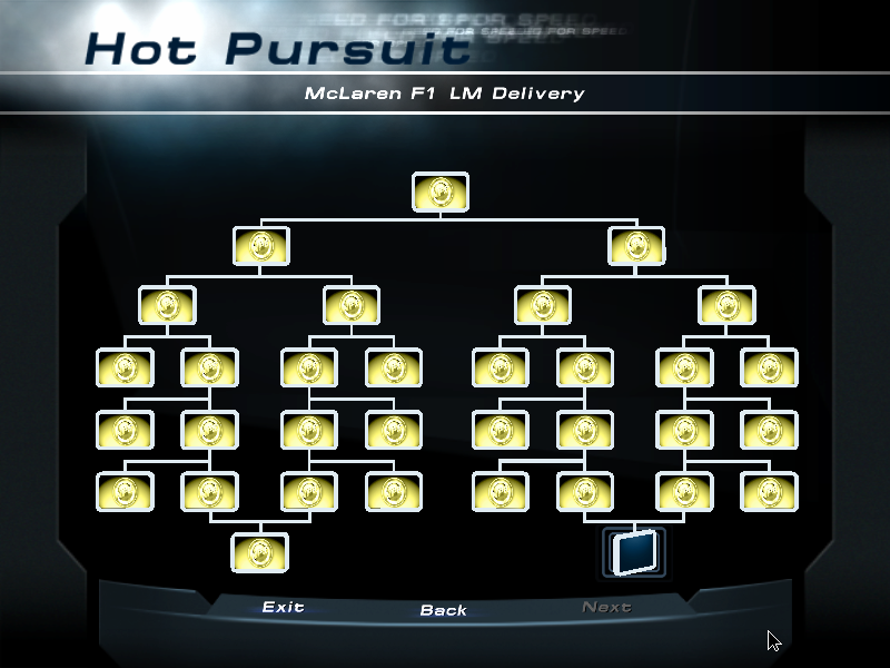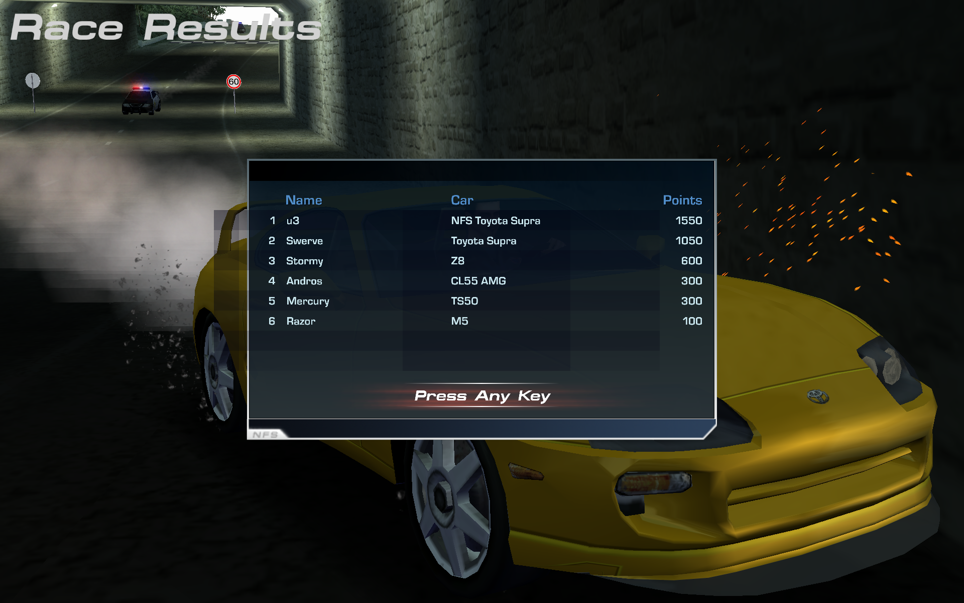 Tournament: a series of races, collect points, at the end the racer with the most points win. The first place get 8 points, the second 7, etc. In single challenge mode, you can select up to 8 races, similar to how it looked like in NFS5.