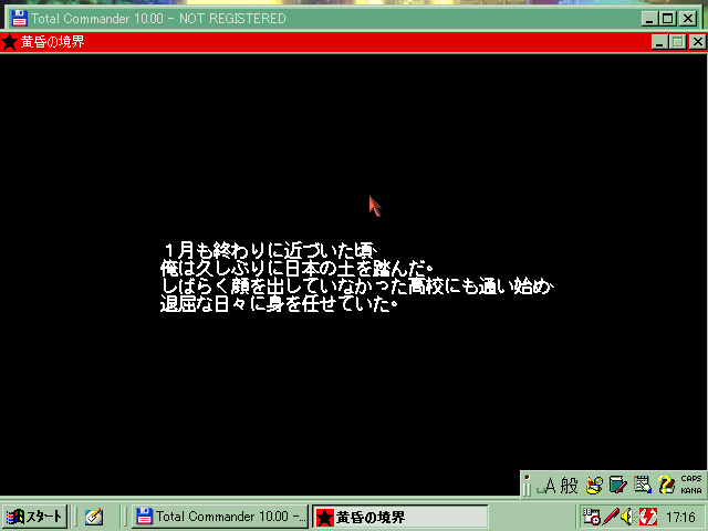 Actually, I don't know what should I write here. This VN is certainly not a master price, but it wasn't bad enough for me to drop either... but I guess reverse engineering the engine and the game were more interesting than actually playing it. I should have measured the reverse engineering time too, not just the gameplay time, because I'm sure it would have been higher. I guess I shouldn't touch any other VN for a year now, for my own sake.